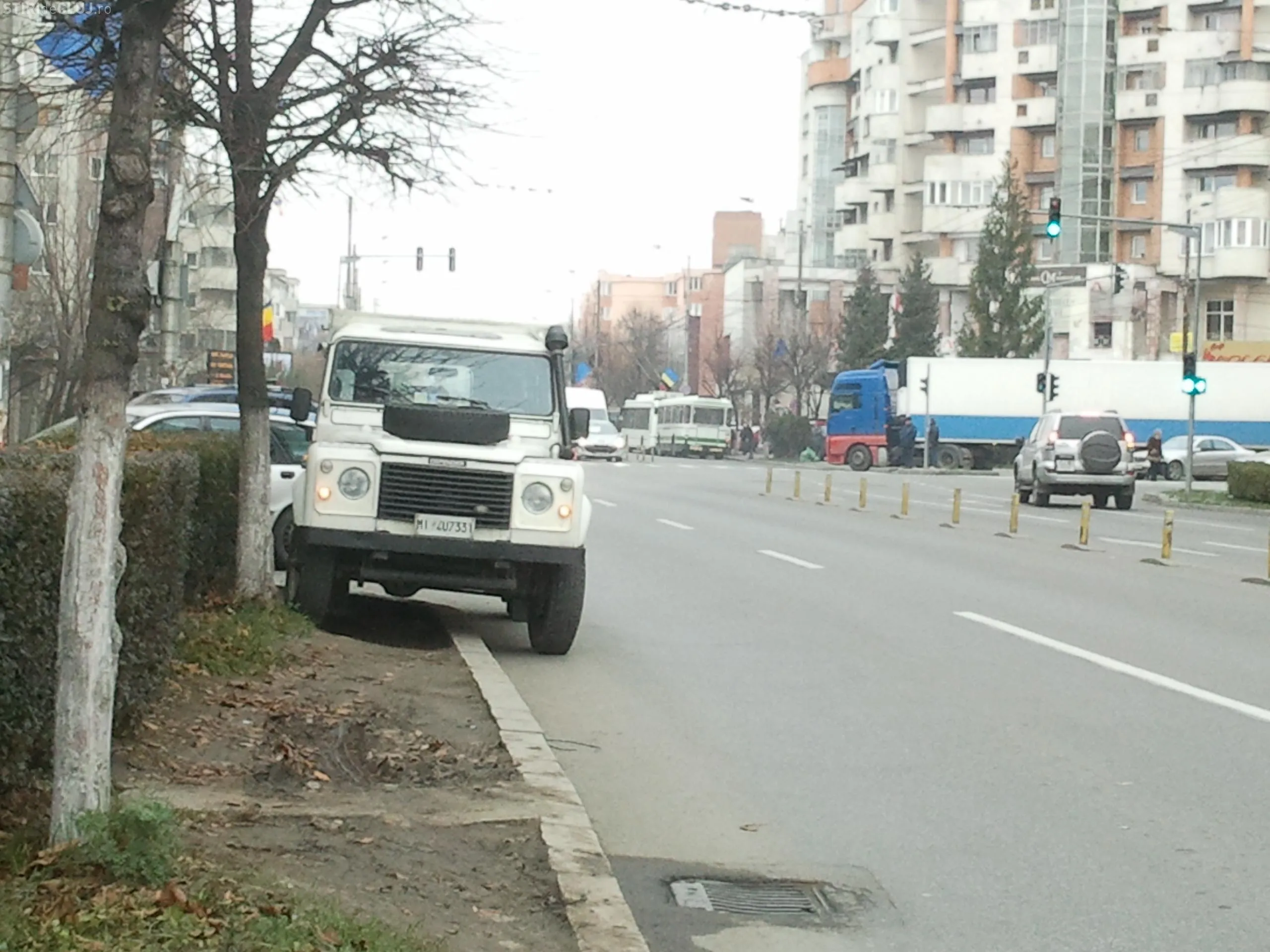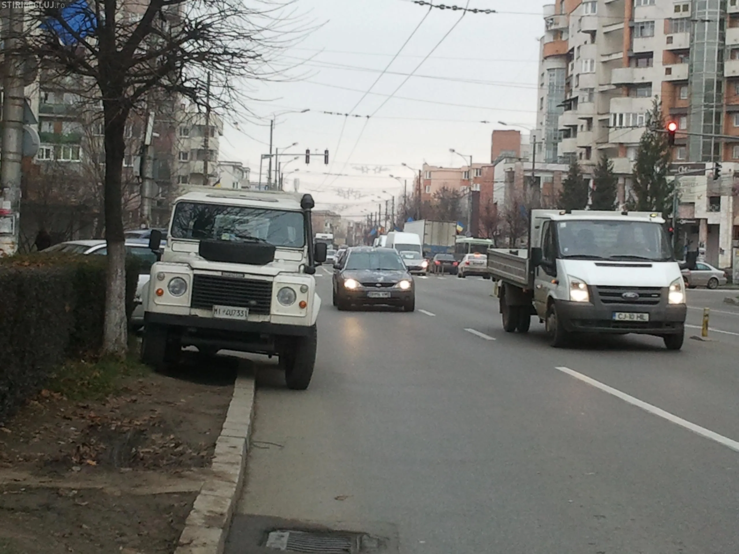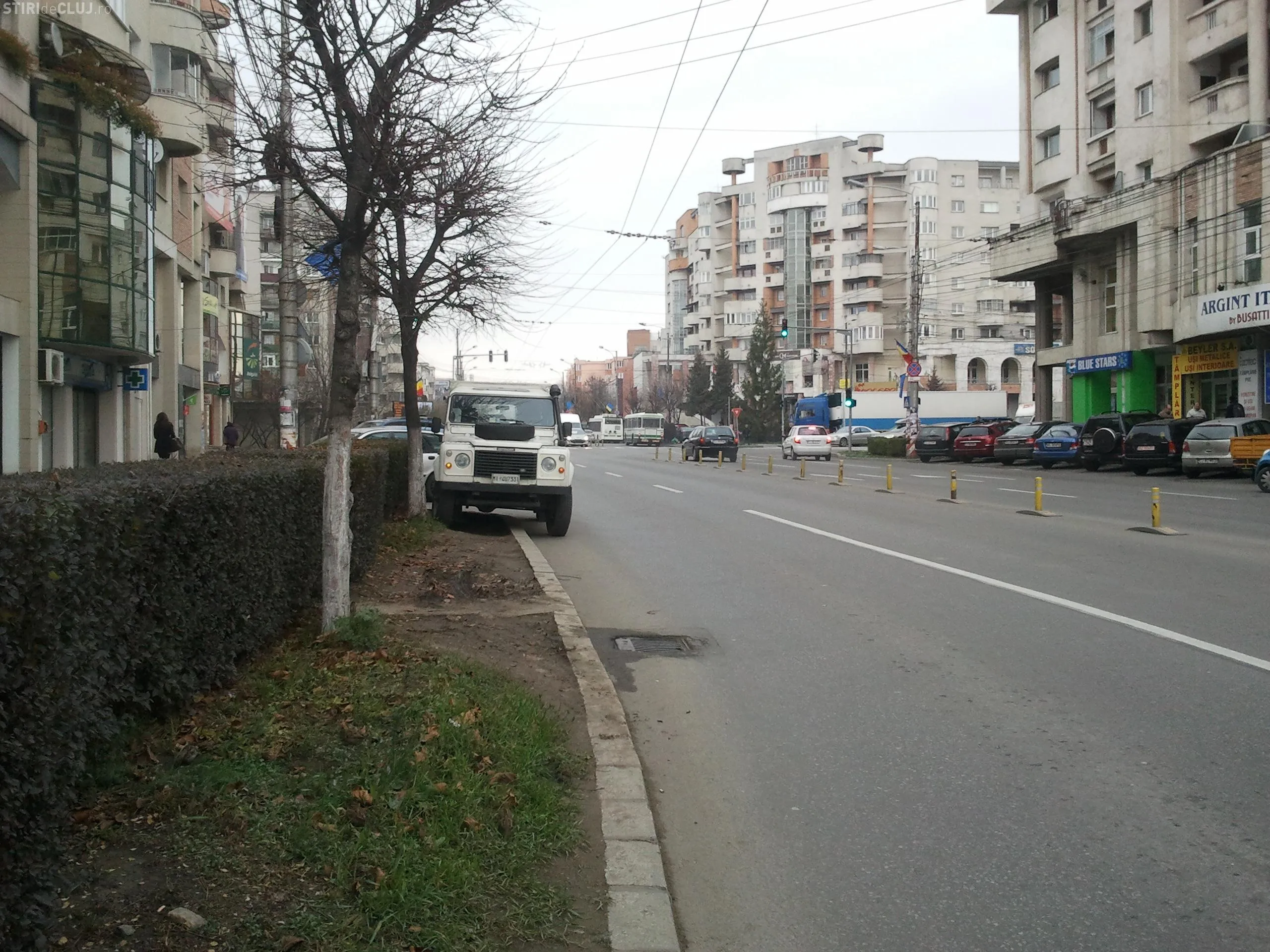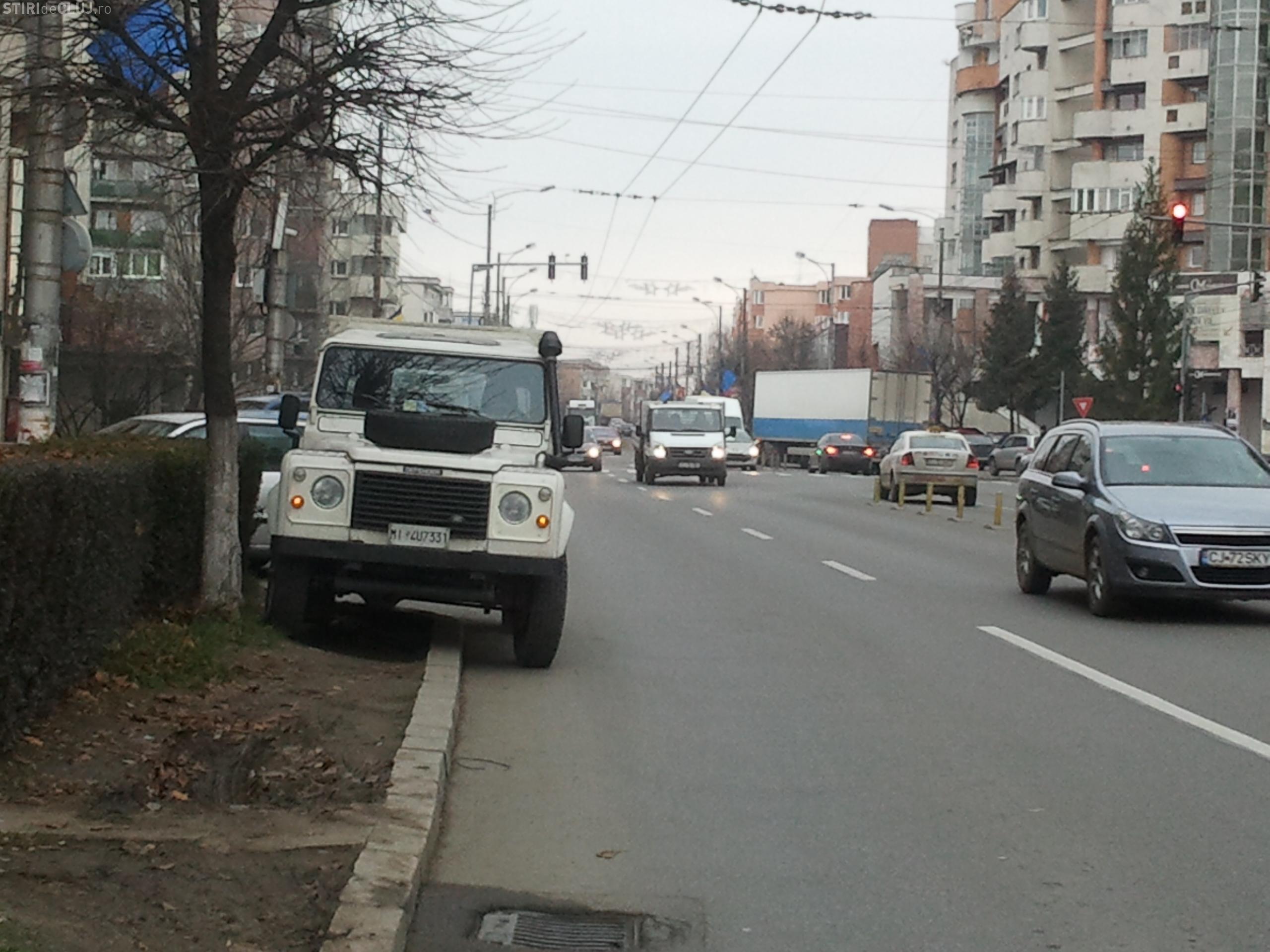 Șoferul unui ”tanc” Land Rover Defender și-a parcat mașina în Piața Cipariu, jumătate pe stradă, aproape de curbă.