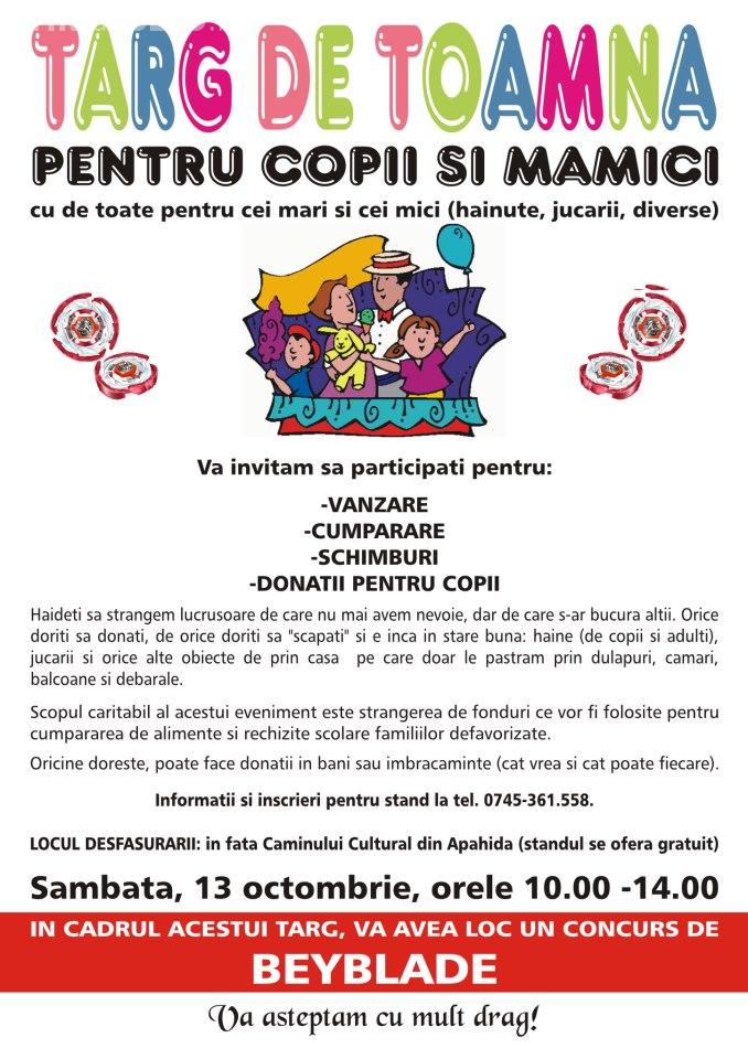 Târgul de Toamnă se va desfășura în fața Căminului Cultural din Apahida, iar standurile se oferă în mod gratuit.