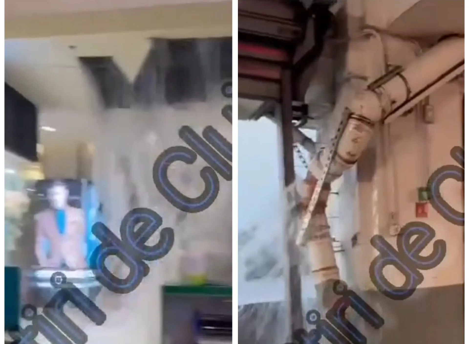 În același timp, în parcarea subterană a mall-ului, o conductă a cedat sub presiunea apei, generând un jet puternic care a inundat rapid zona.