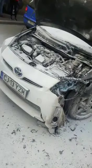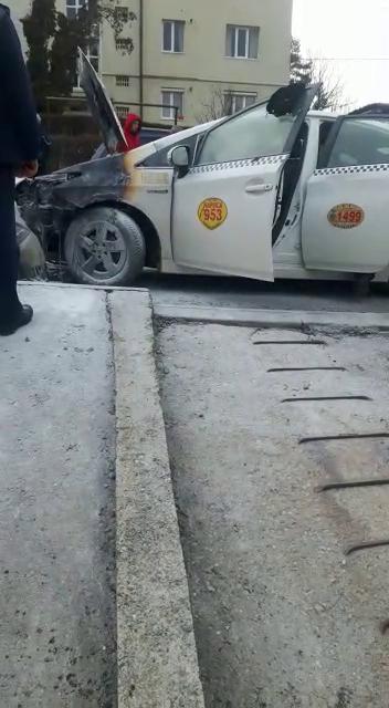 Taxiul s-a aprins din senin, iar mai mulți șoferi au intervenit cu stingătoarele și au limitat paguba. Cel care a filmat se întreabă dacă mașinile hybrid sunt mai sigure ca cele pe carburanți tradiționali, având în vedere că instalțiile electrice iau foc ușor.