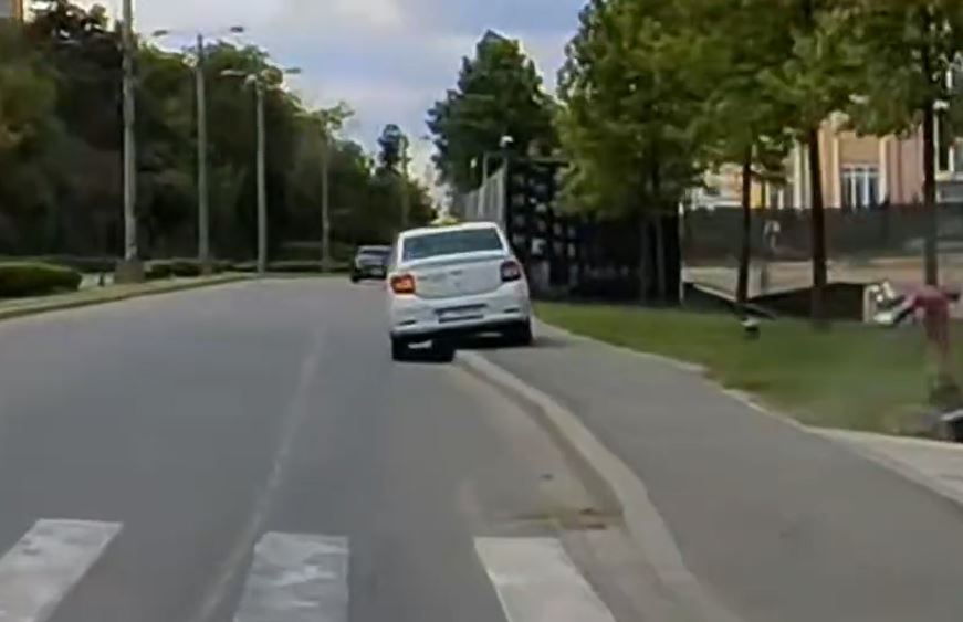 Un incident bizar a fost filmat azi chiar la sensul giratoriu din fața Iulius Mall. Un taxi, mașină Dacia Logan de culoare albă., care a ieșit regulamentar din sensul giratoriu spre strada Slănic a căpătat brusc o traiectorie ciudată.