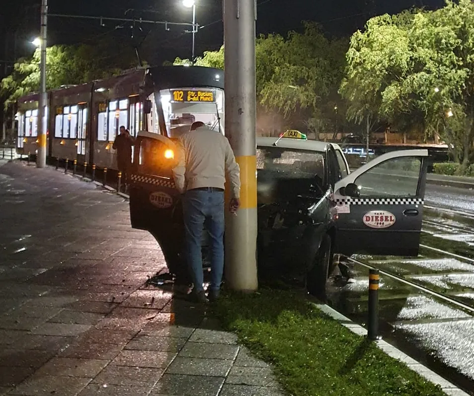 Taximetristul s-a dus direct cu mașina în stâlpul pe pe marginea drumului. Din fericire nimeni nu a foist rănit, doar traficul tramvaielor a fost afectat.