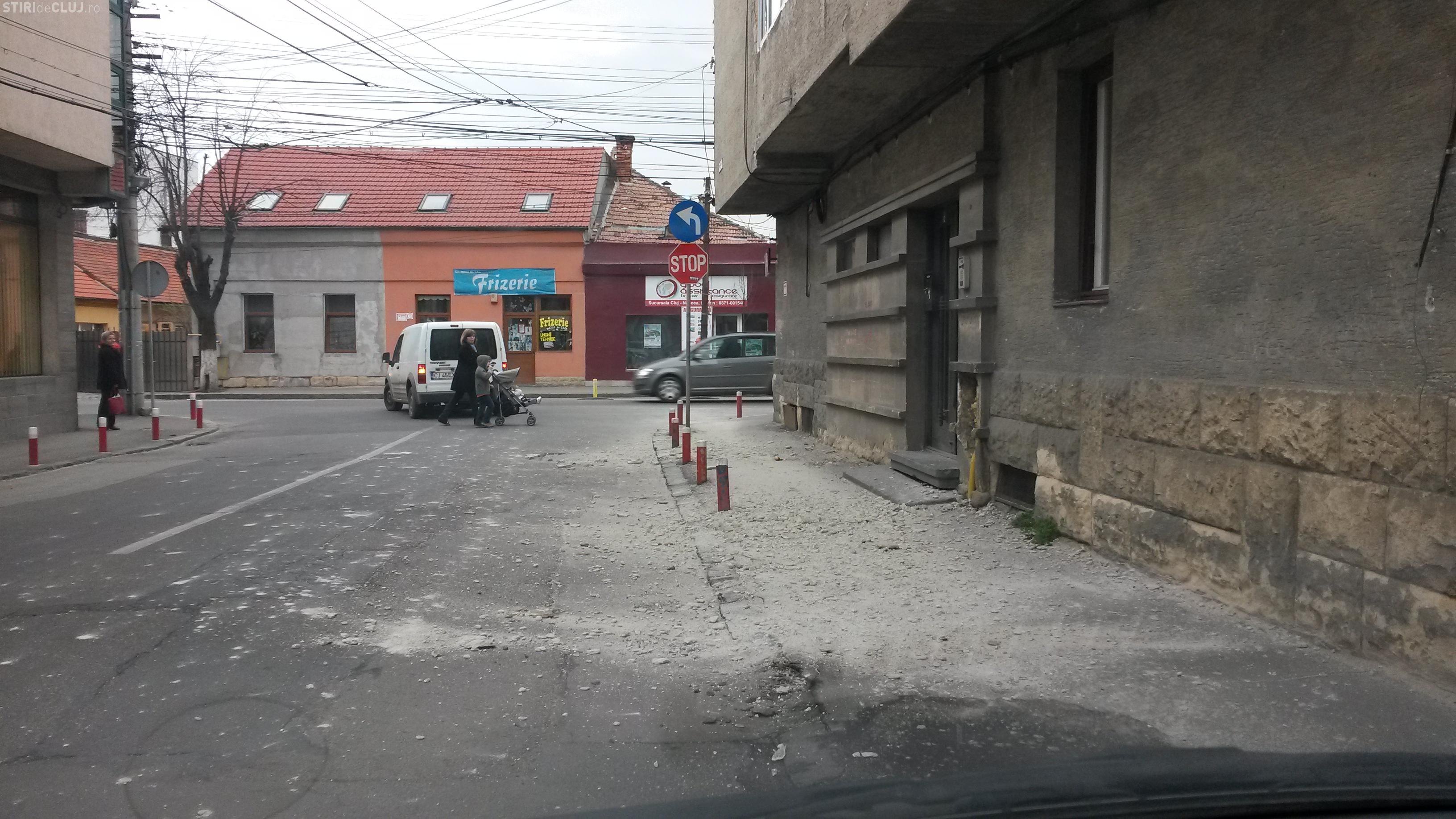 Tencuiala de pe o clădire de pe strada Cloșca, din centrul Clujului, a căzut pe o mașină parcată pe marginea drumului.