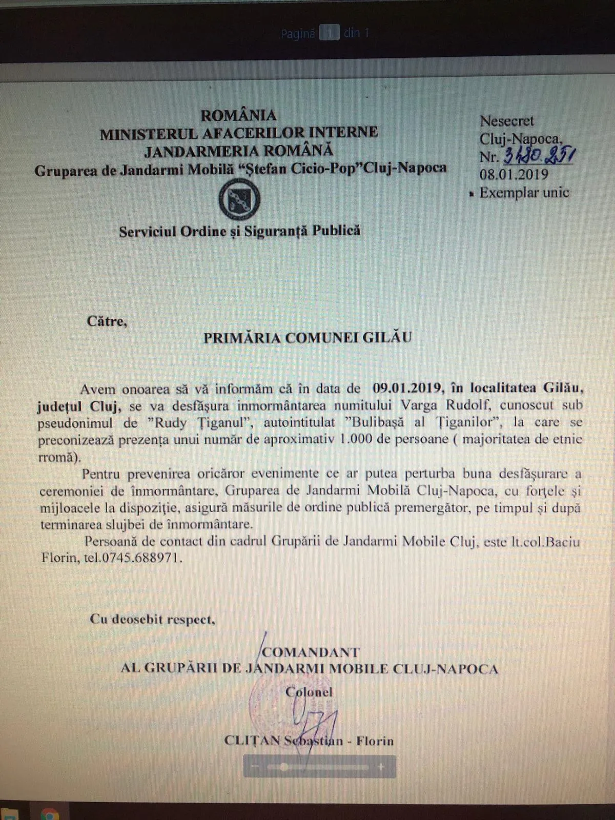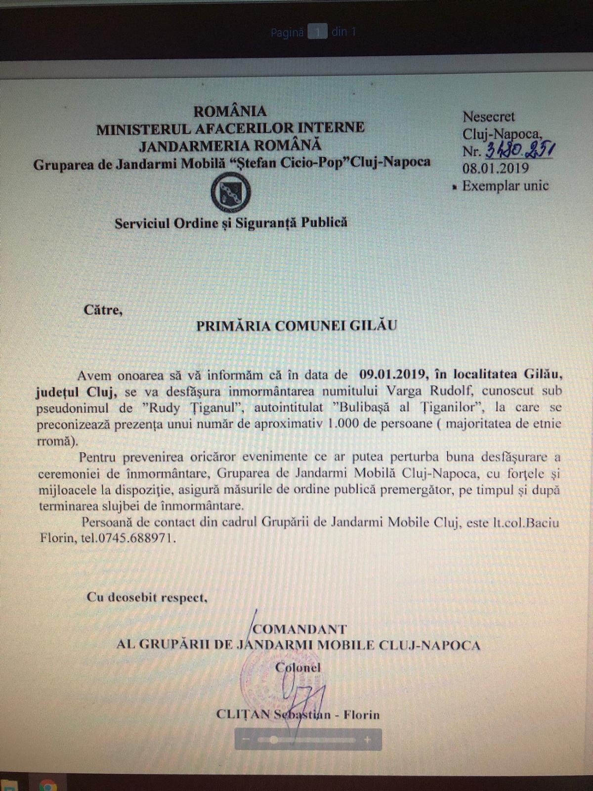 Conform Grupării Mobile de Jandarmi Cluj-Napoca la înmormântarea lui Rudolf Varga, ”cunoscut sub pseudonimul de ”Rudy Țiganul”, autointitulat ”Bulibașă al Țiganilor”, se preconizează prezența unui număr de aproximativ 1.000 de persoane (majoritatea de etnie romă)”.