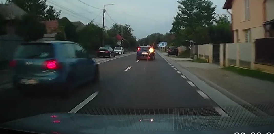 Camera de bord a unui participant la trafic a surprins momentul în care doi șoferi se cred într-un film de curse. Aceștia depășesc, pe linie continuă și peste o trecere de pietoni, autoturismul care a captat momentul ilegal.