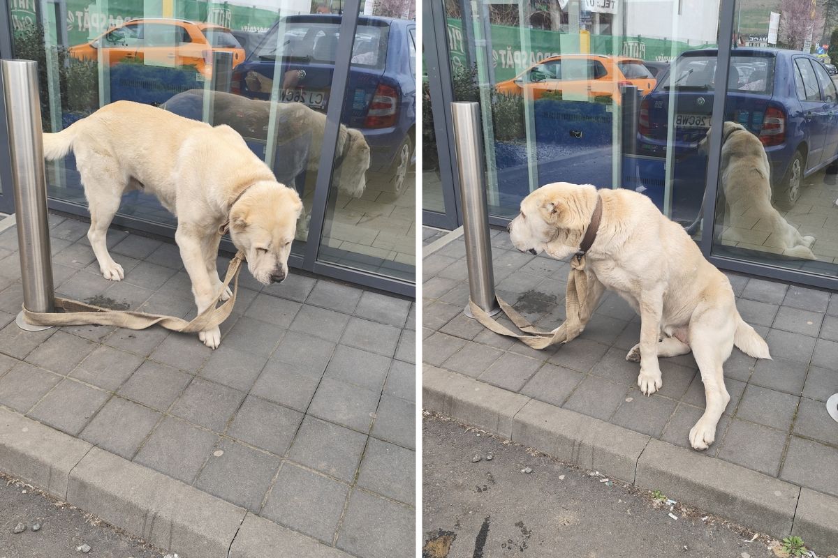 Ți se rupe inima! Un câine a fost legat de un stâlp și abandonat lângă un magazin din Cluj. Proprietarul l-a „recuperat” după 10 ore