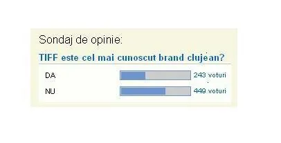 In ultimele 7 zile au votat aproape 700 de persoane, dintre care 449 au spus ca TIFF nu este cel mai cunoscut brand clujean si alti 243 au afirmat contrariul.