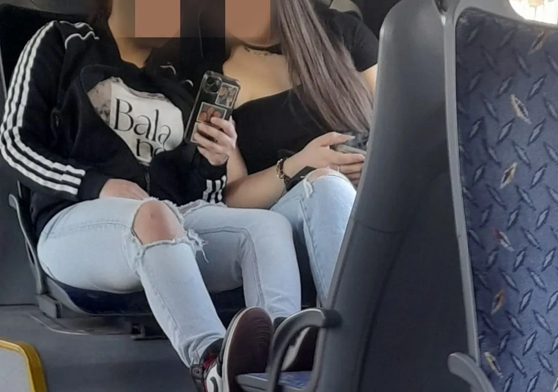 Două tinere au fost fotografiate, în timp ce stăteau, fără vreo grijă cu picioarele pe scaunul din față într-un autobuz.