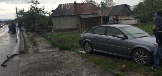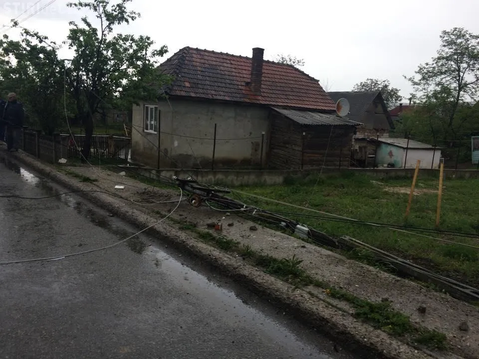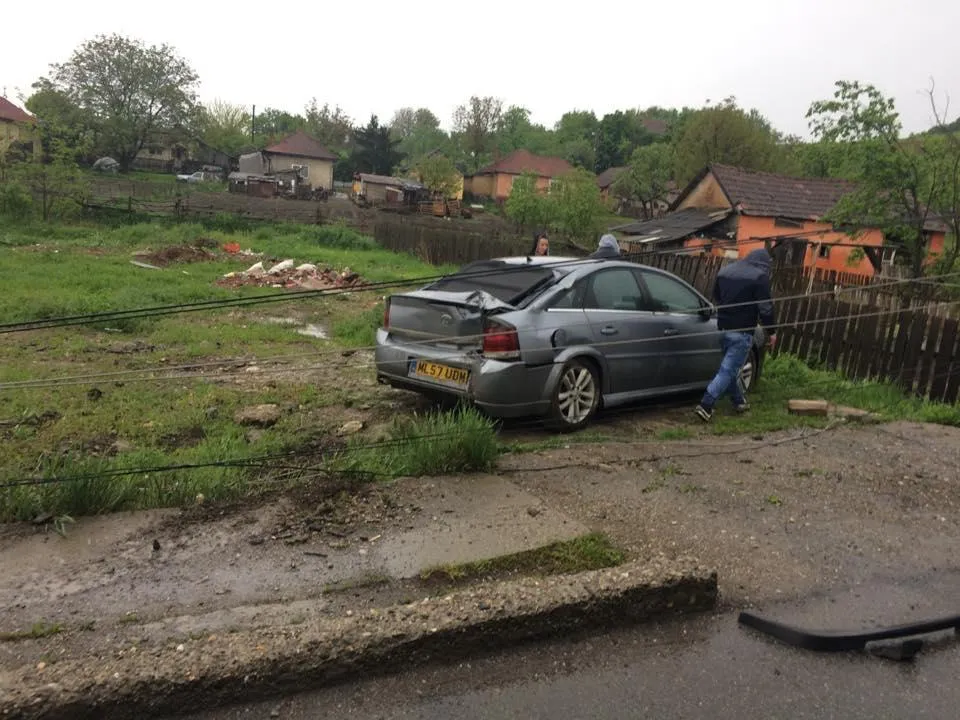Stâlpul de electricitate s-a rupt în urma impactului, firele de curent ajungând pe șosea, iar șoferul unui TIR, care circula din sens opus, abia a reușit să avite impactul.