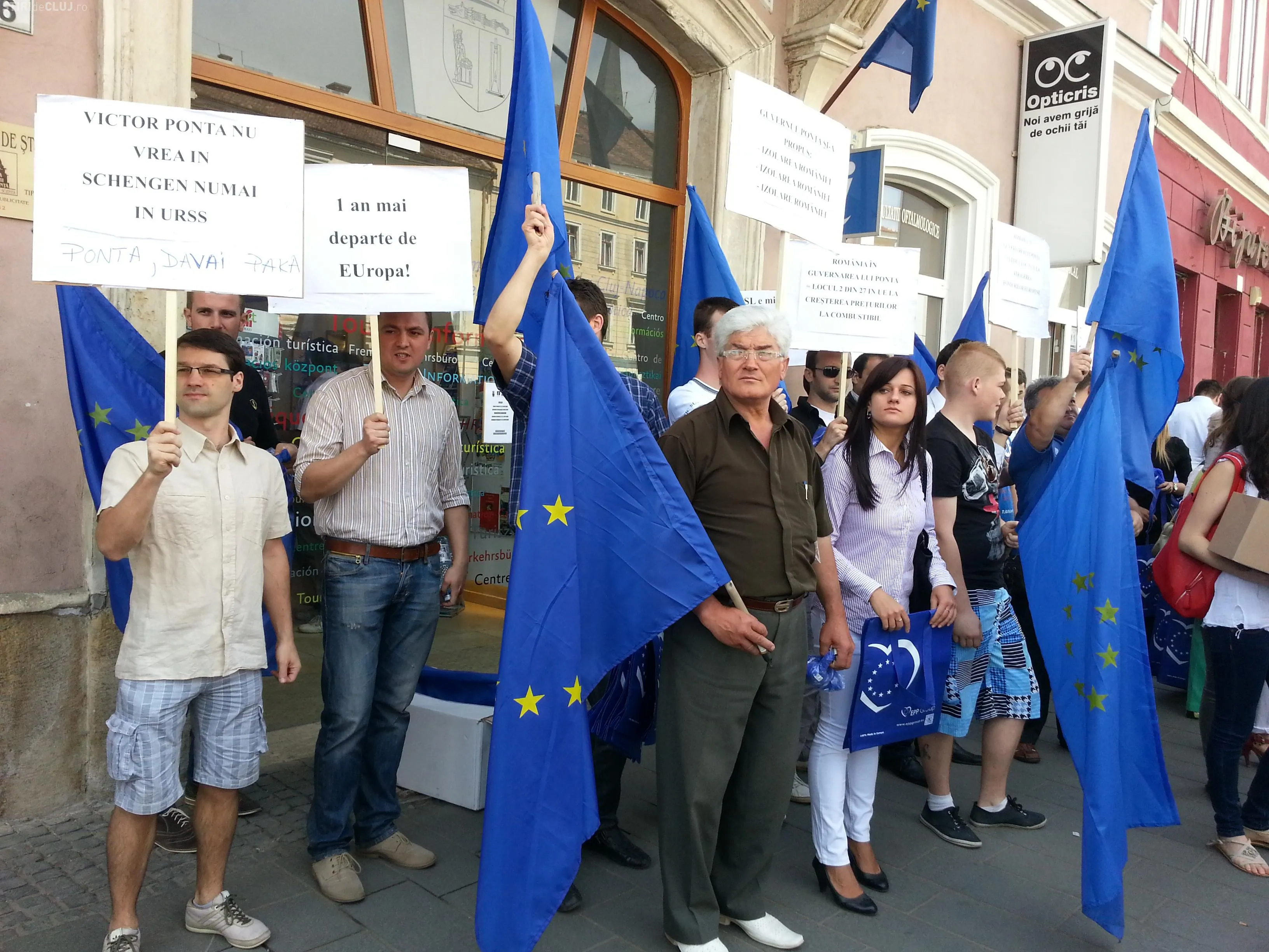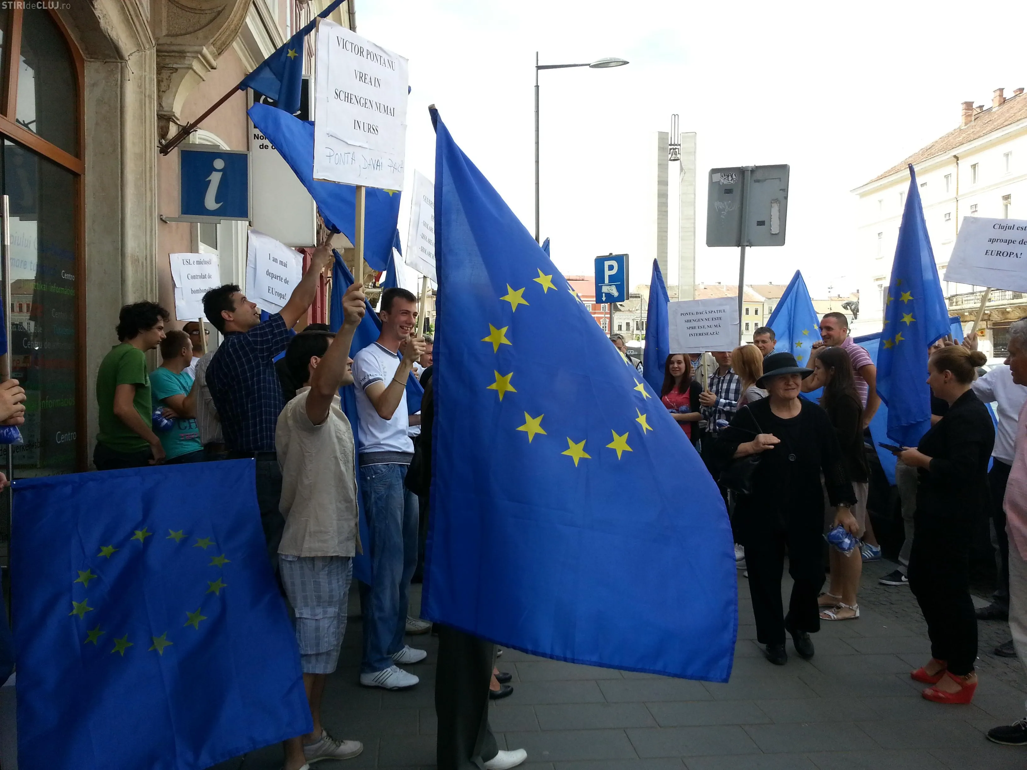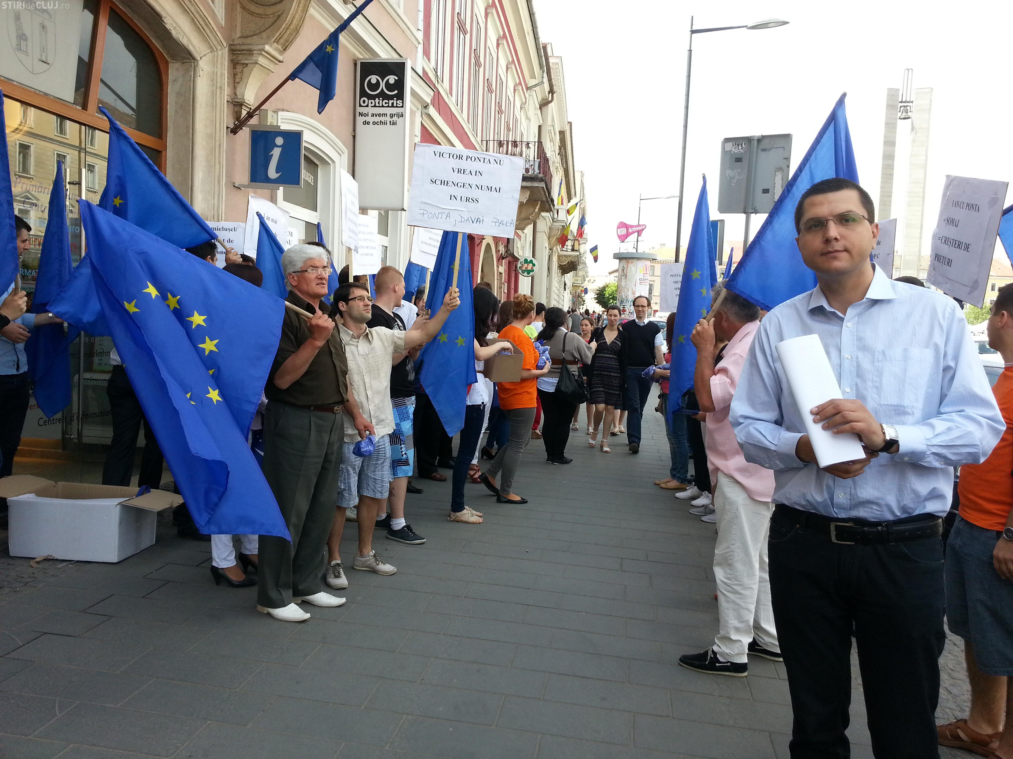Tinerii PDL Cluj au protestat, joi, 9 mai, în fața sediilor PNL și PSD Cluj, de pe Bulevardul Eroilor, acuzând cele două partide de ratarea aderării României la spațiul Schengen.