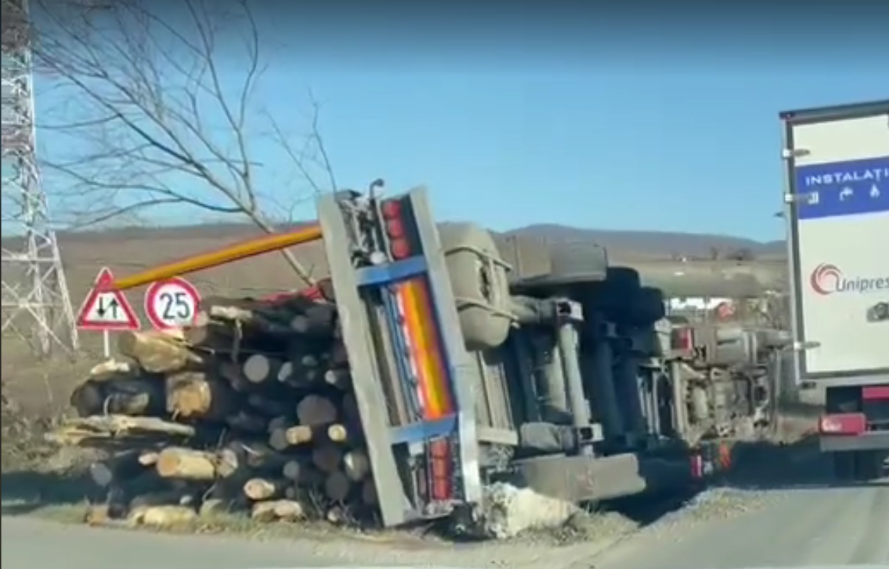 Un TIR cu lemne s-a răsturnat pe Autostrada 10, la Stejeriș.