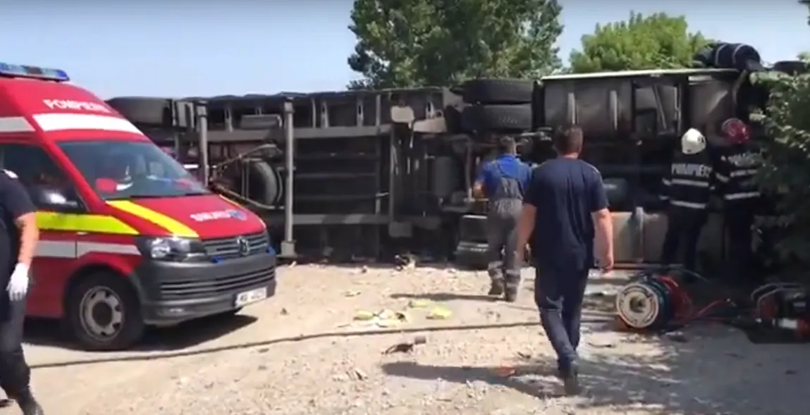 Pompierii au intervenit pentru a extrage șoferul rămas blocat în cabina autotrenului răsturnat și pentru a acorda primul ajutor calificat acestuia, precum și unei pasagere din autovehiculele implicate în accident.