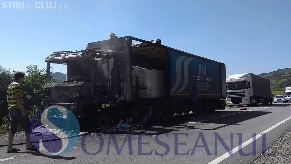 TIR plin cu hârtie a luat foc pe un drum din Cluj. A ars ca o torță VIDEO