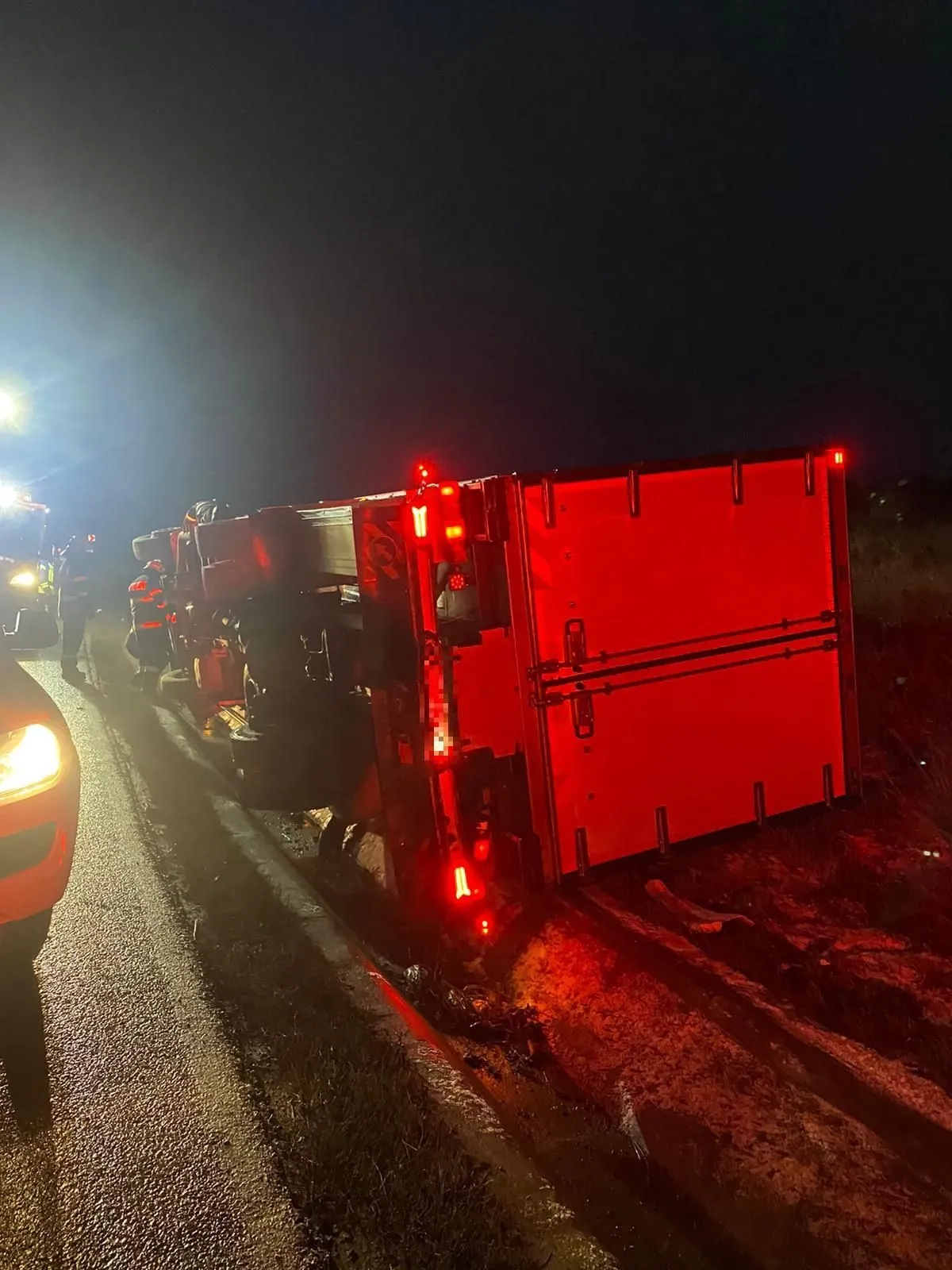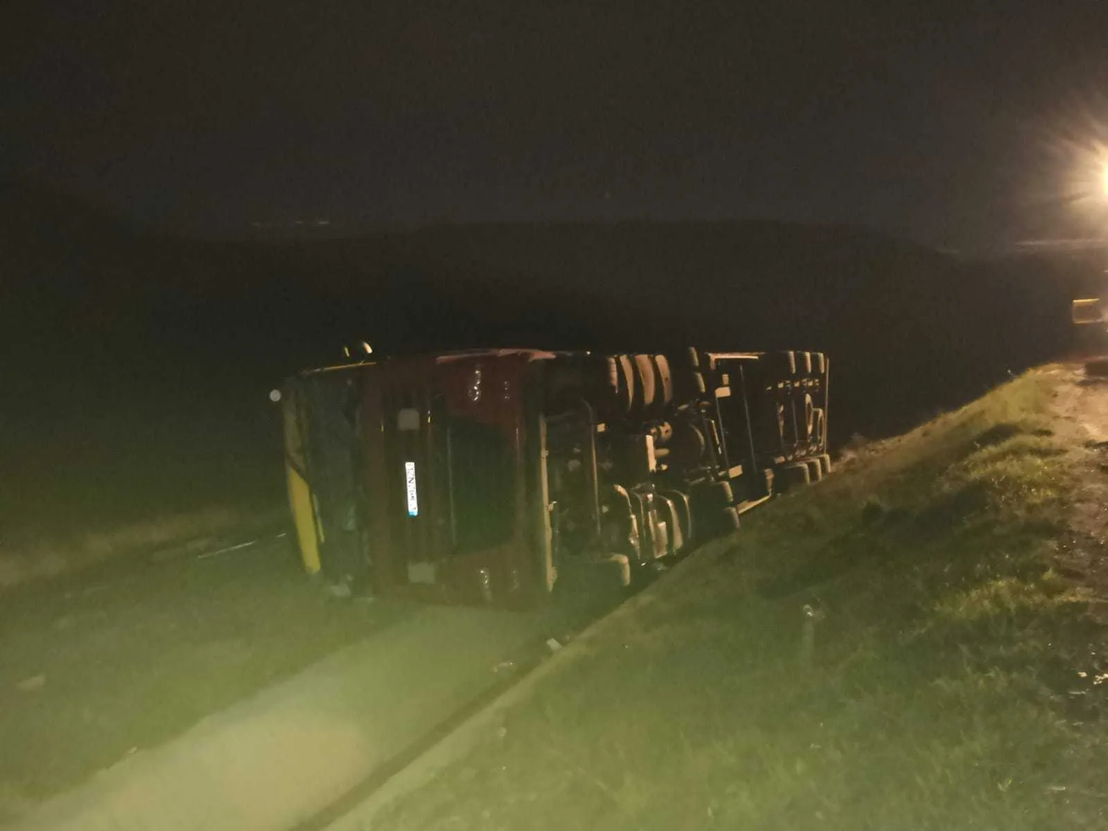 Din primele informații, conducătorul ansamblului de vehicule, respectiv un bărbat de 55 de ani, din județul Buzău, ar fi pierdut controlul asupra direcției de deplasare, răsturnându-se în afara părții carosabile.