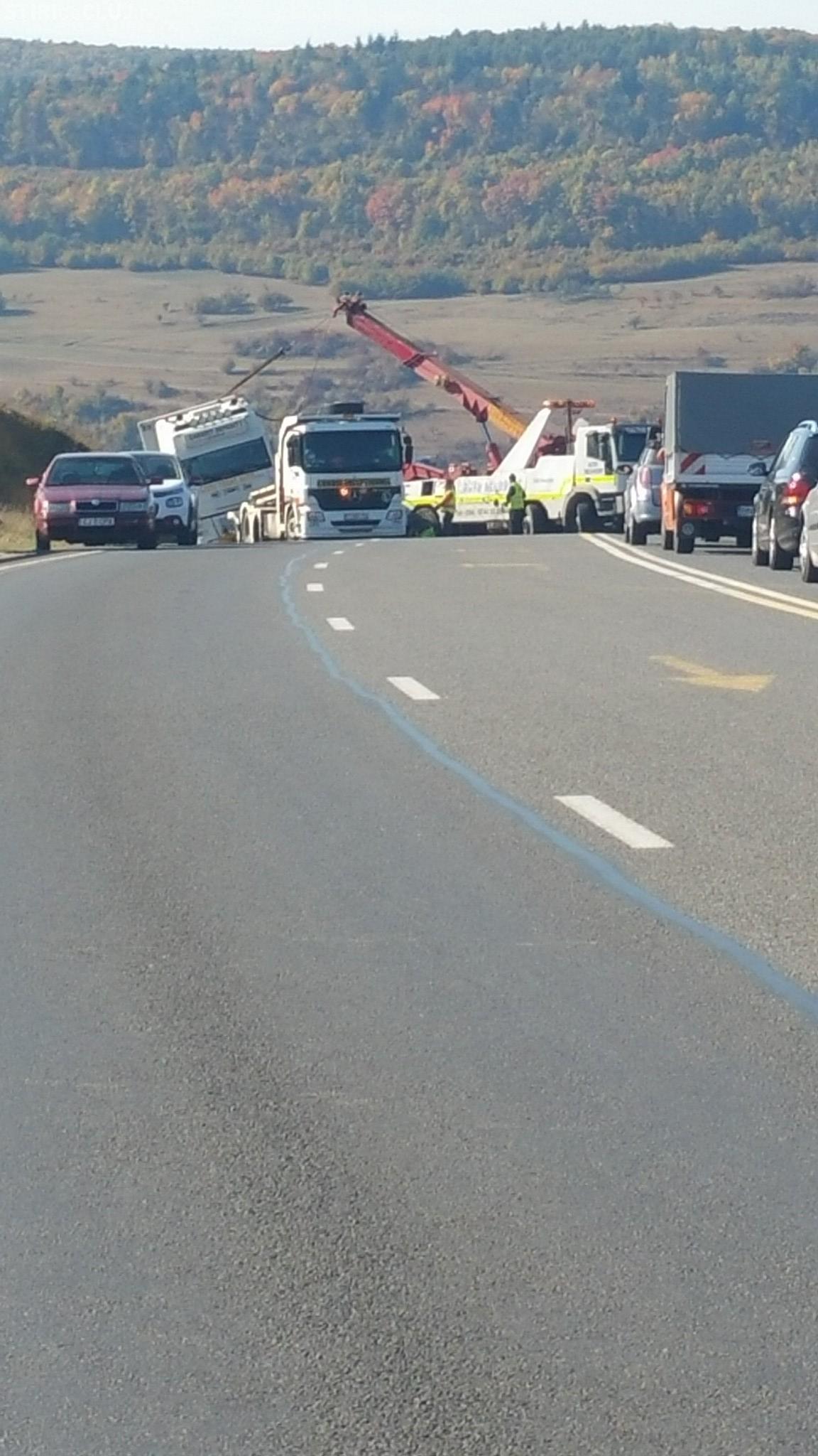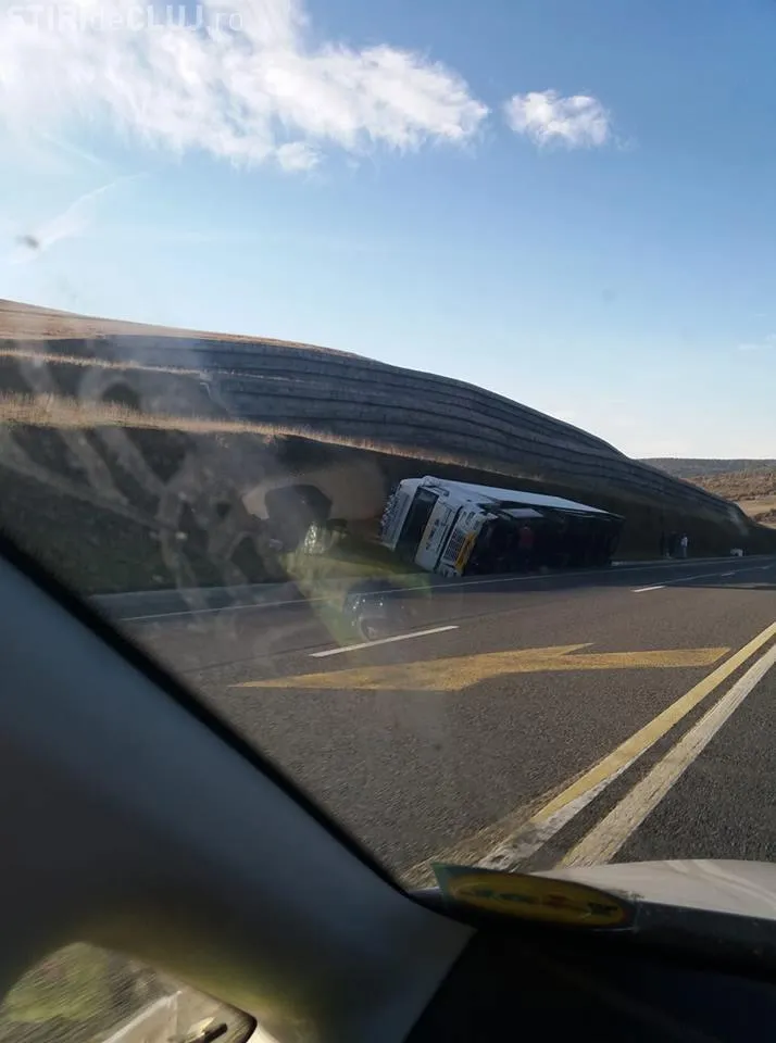 Din primele informații, un șofer clujean ar fi scăpat de sub control TIR-ul și s-a răsturnat pe marginea drumului.