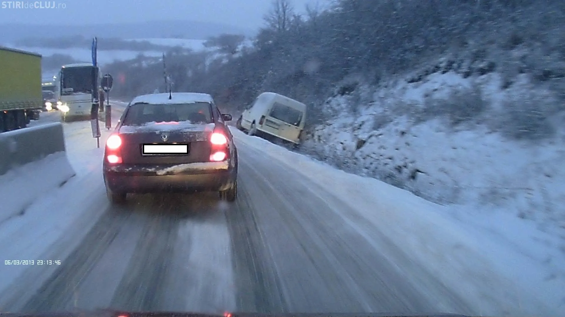 ”Am filmat in dimineata aceasta in jurul orei 8, drumul inzapezit si camioanele blocate din cauza incompetentei drumarilor pe care i-a luat prin surprindere”, ne-a scris clujeanul.