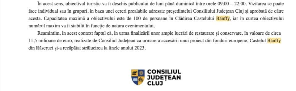 Amintim că, în 27 iunie, CJ Cluj anunțase prin intermediul unui comunicat că vizitarea Castelului Banffy din Răscruci se poate face individual sau în grupuri, în baza unei cereri prealabile adresate președintelui Consiliului Județean Cluj și aprobată de către acesta. Situația a fost confirmată ulterior și de senatorul clujean Adrian Oros căruia i s-a zis că obiectivul nu poate fi vizitat fără o cerere la Consiliul Județean, când a ajuns la fața locului.