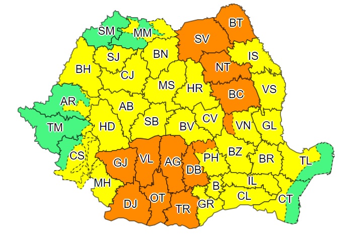 În județele Suceava, Botoșani, Neamț, Bacău, Argeș, Dâmbovița, Teleorman, Gorj, Vâlcea, Olt, Dolj, precum și în zona de munte a județelor Vrancea și Prahova instabilitate atmosferică va fi accentuată și se va manifesta prin intervale cu averse torențiale, intensificări ale vântului, vijelii, grindină și frecvente descărcări electrice. În intervale scurte de timp sau prin acumulare, se vor înregistra cantități de apă ce vor depăși 40 l/mp și izolat 50...70 l/mp.