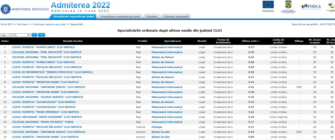 NOTA: Pentru o comparatie corecta cu celelalte licee, trebuie precizat ca Liceul de Informatica are trei clase( 78 de locuri). Daca ar fi avut doua clase, ca si Liceul Avram Iancu si Colegiul National Emil Racovita, atunci media aritmetica pentru 52 de elevi admisi era 9.706 si ar fi fost pe locul 3, inaintea Liceului Nicolae Balcescu)