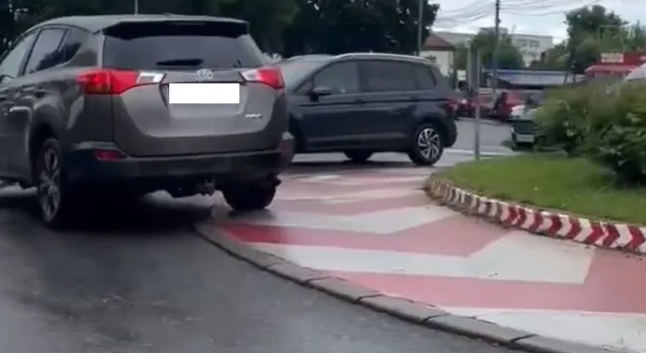 Primul punct sensibil îl reprezintă manevrele de schimbare a benzii ale mașinilor care vin dinspre Bulevardul Muncii și virează stânga în sensul giratoriu. Lipsa marcajelor interioare din sens face ca numeroși șoferi să iasă pe direcție orizontală către banda din dreapta, unde recentul șantier a transformat linia continuă în una discontinua.