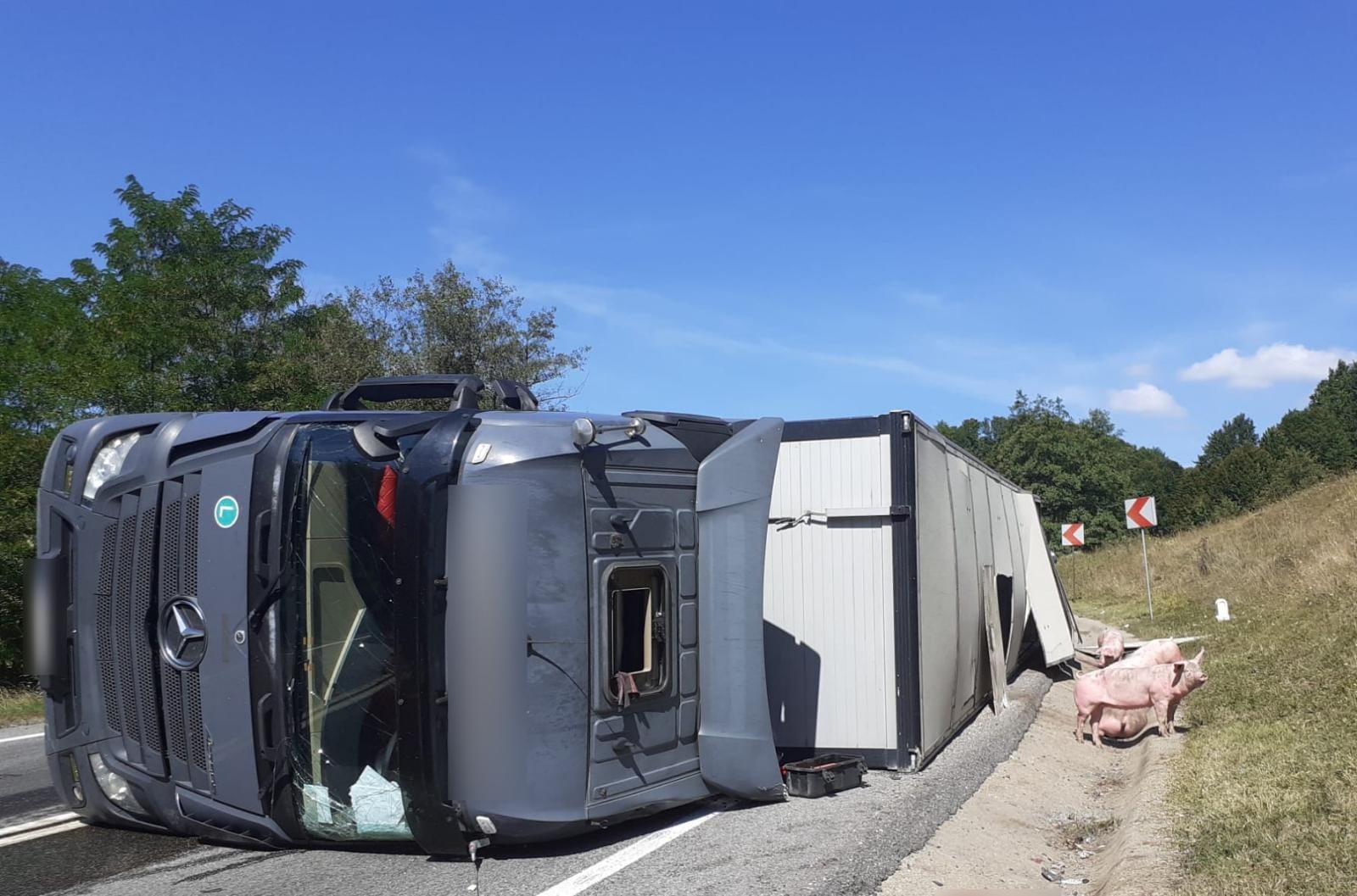 Un ansamblu de vehicule care transporta porci s-a răsturnat pe stradă, în localitatea Bucea, înspre Huedin. Momentan se circulă pe un singur sens.
