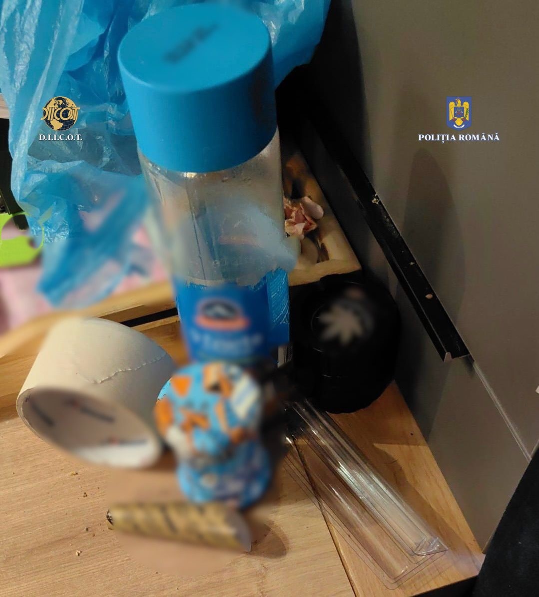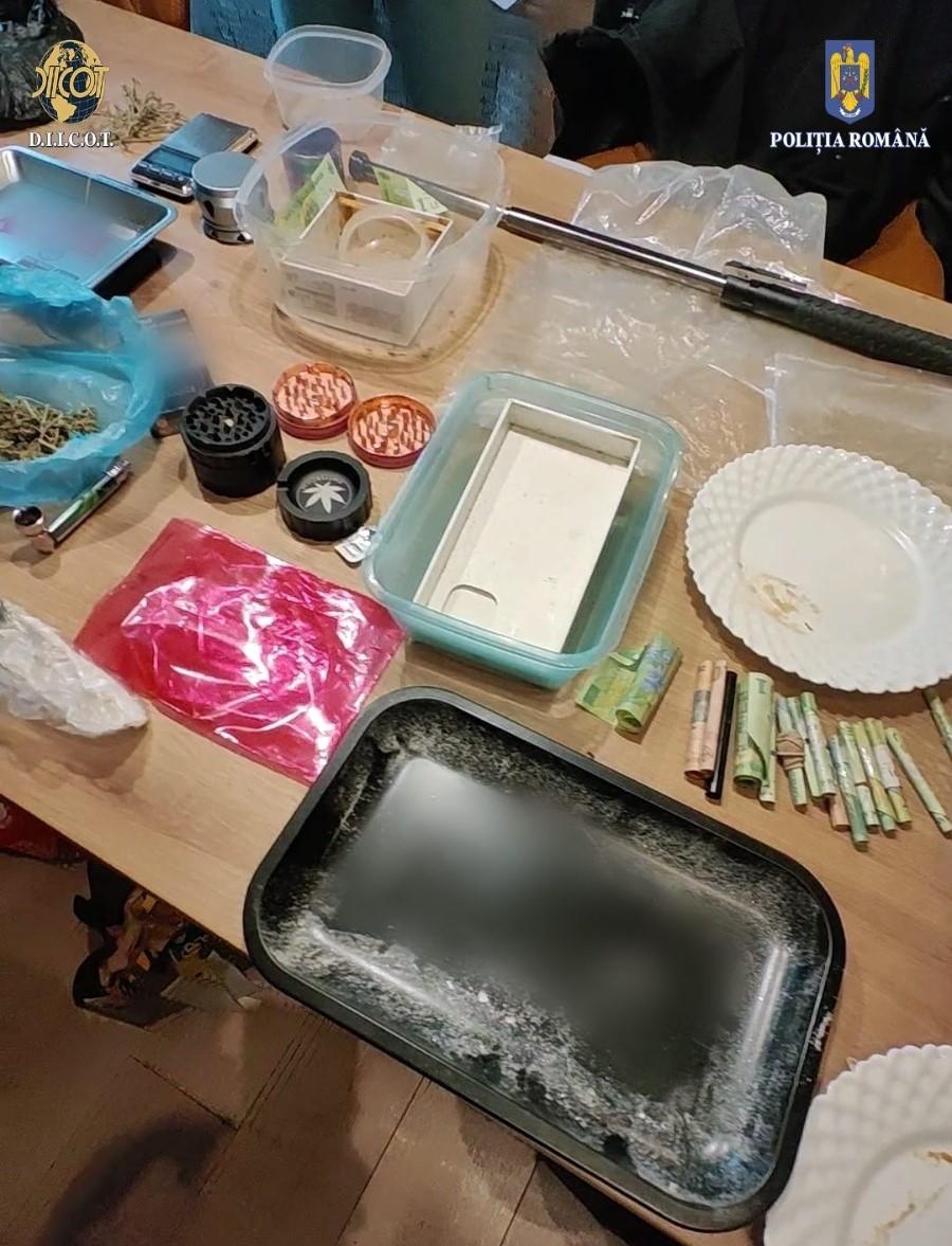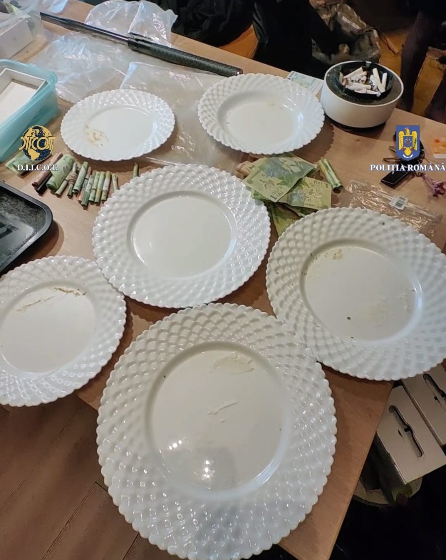 De asemenea, au fost descoperiți și ridicați peste 11.000 de lei, un cântar de mare precizie, peste 25 de bancnote rulate, farfurii și tăvi cu urme de substanță, precum și alte mijloace de probă.