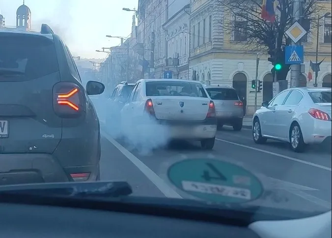 Un șofer din Cluj-Napoca a surprins și distribuit pe rețelele de socializare un moment alarmant din trafic, în care o mașină scotea un fum dens din țeava de eșapament, stârnind îngrijorare printre participanții la trafic.