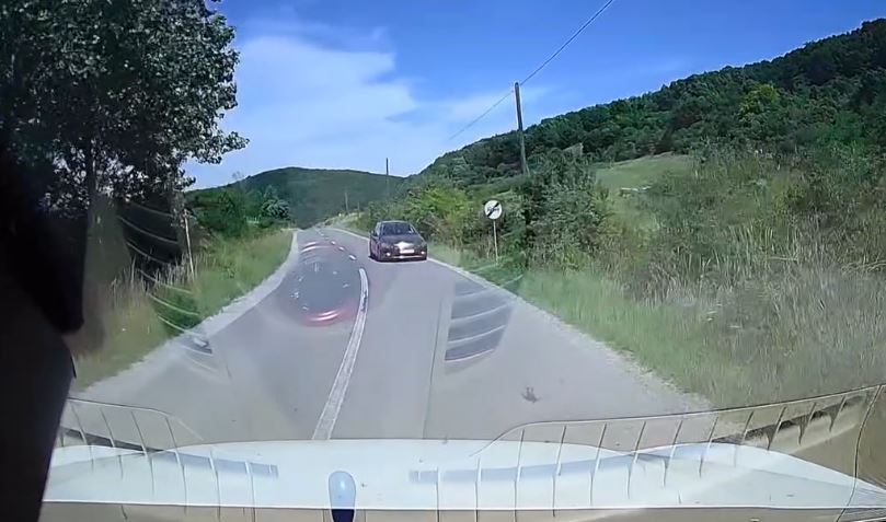 Un șofer care conducea pe un drum slab circulat a avut surpriza să dea ”nas în nas”, după o curbă, cu o mașină care venea în sens invers pe aceeași bandă.