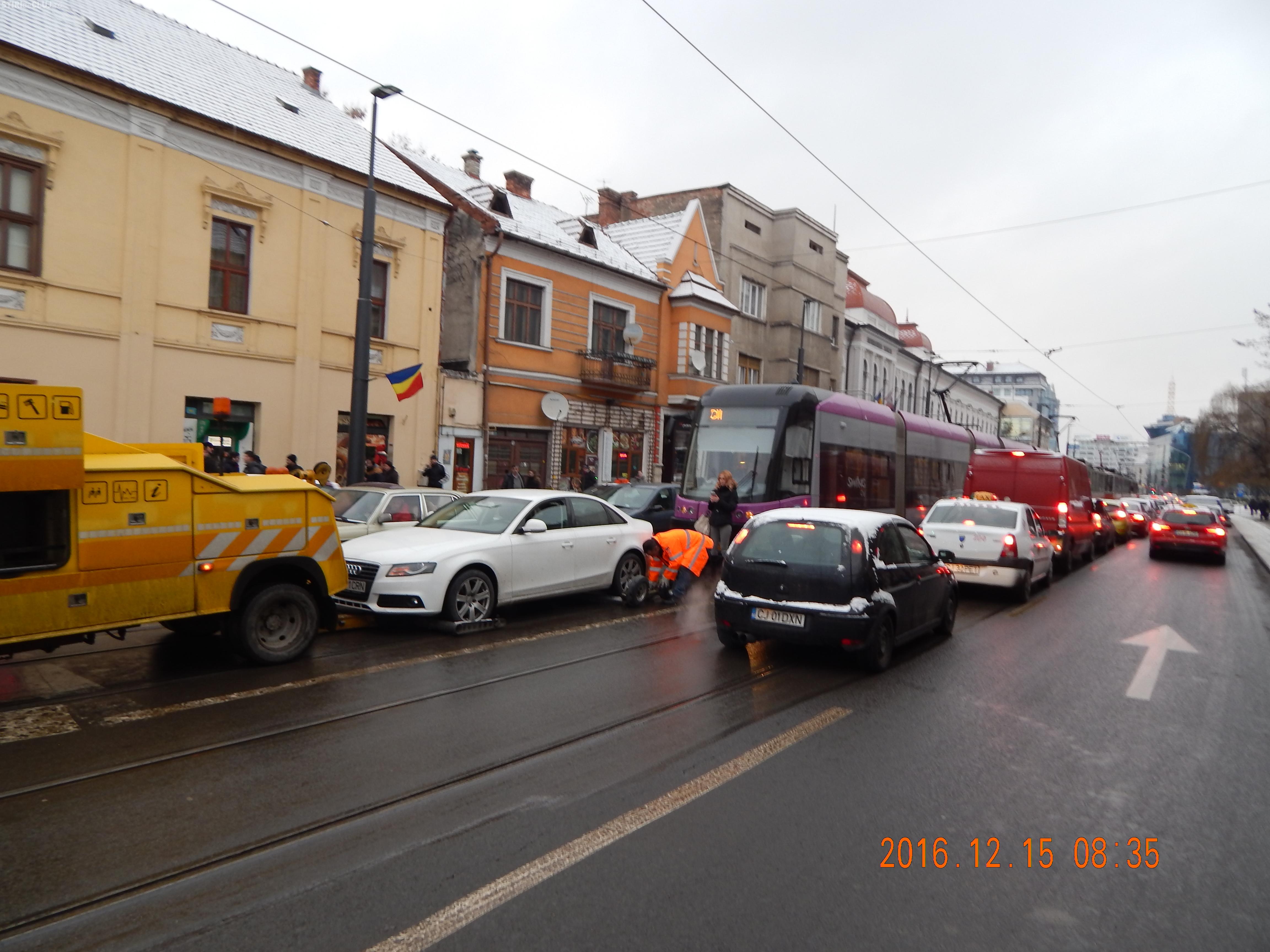 ”In data de 15.12.2016, circulatia tramvaielor a fost blocata pe strada Baritiu timp de 57 minute in intervalul orar 07:40 – 08:37 spre cartierul Manastur , din cauza unui autoturism ramas defect in gabaritul liniei de tramvai.