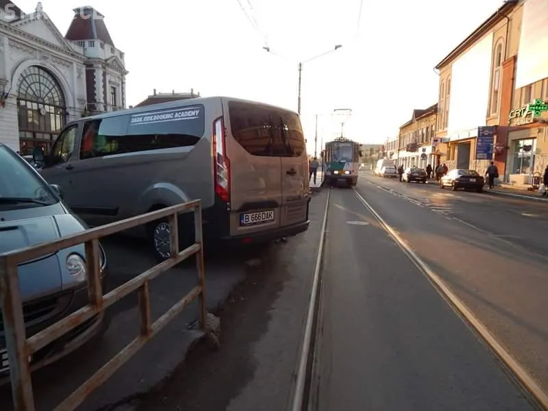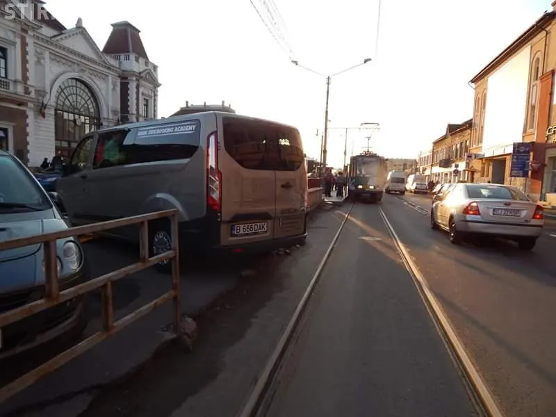 Șoferul unei dubițe a parcat pe trotuar, dar spatele mașinii a obturat trecerea tramvaielor.
