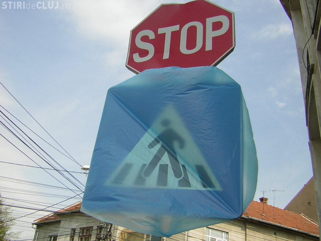 Chiar in centrul Clujului, la intersectia strazilor Paris si Nicolae Balcescu, un clujean a surprins imagini cu doua semne de circulatie protejate sau anulate cu saci din plastic.