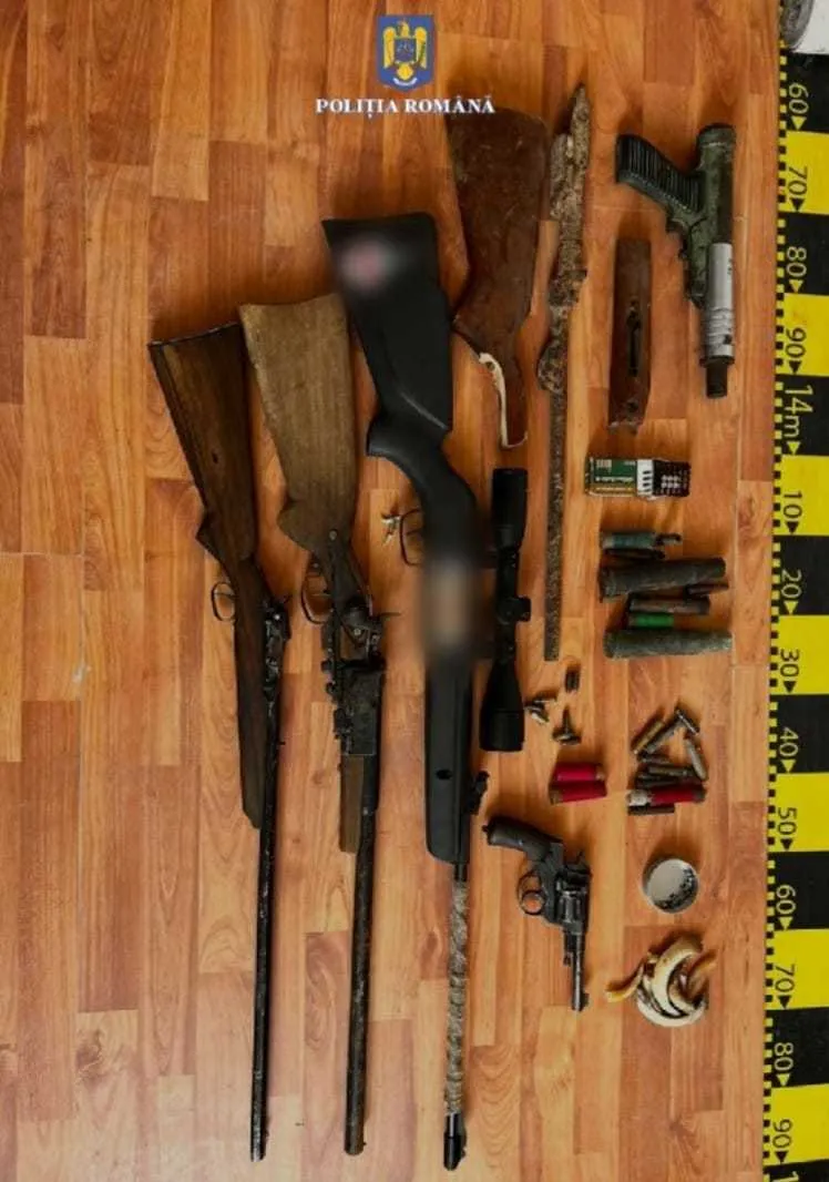 În urma percheziţiilor, au fost ridicate o armă confecţionată artizanal, o armă cu glonţ, o armă cu aer comprimat, un pistol cu butoiaş, o ţeavă metalică de armă, un pat de lemn pentru armă, un uluc de lemn pentru armă, un dispozitiv din metal cu formă de pistol, prevazut cu mecanism de percuţie, 14 cartuşe, 12 tuburi de cartuşe percutate, o cutie cu 10 alice, mai multe trofee de colţi şi pinteni de animale.