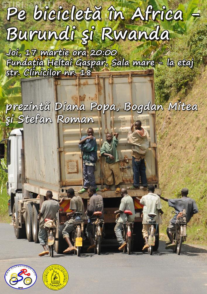 Clubul de Cicloturism "Napoca" organizeaza joi, 17 martie, de la ora 20.00, la biblioteca "Heltai" pe strada Clinicilor nr. 18, o proiectie de imagini pe tema "Cu bicicleta prin Africa: Burundi si Rwanda".