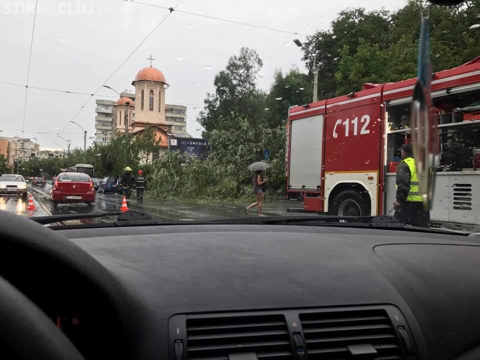 Mai multi copaci au căzut pe carosabil pe strada Plopilor, în urma furtunii care a lovit Cluj-Napoca în jurul orei 14.00.