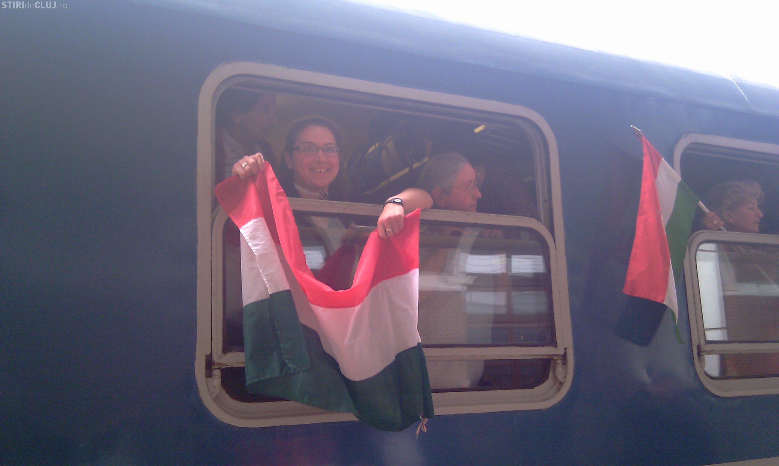 Trenul Nostalgia care duce 1000 de cetateni maghiari la sarbatoarea de la Sumuleu Ciuc, judetul harghita, a oprit astazi pentru circa 15 minute si in Gara Cluj. Oamenii au fluturat steagurile Ungariei in momentul in care au ajuns la Cluj.