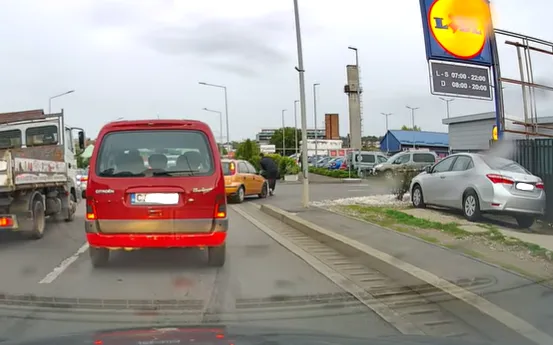 Un șofer dorește să intre în parcarea magazinului și face dreapta, chiar în momentul în care trotinetistul trece. Din fericire, șoferul a frânat iar tânărul a reușit să se ferească de mașină.