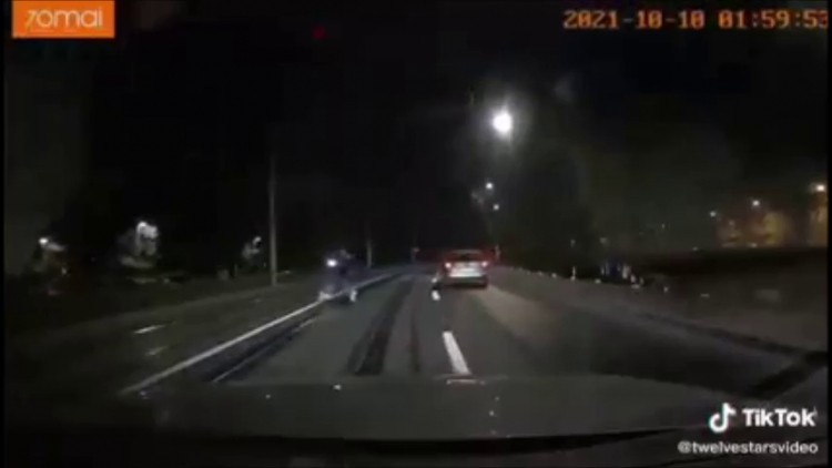 Imaginile au fost surprinse de un șofer care circula regulamentar și care a apucat să tragă ușor de volan, pentru a nu se urca pe cei doi tineri împrăștiați pe carosabil.