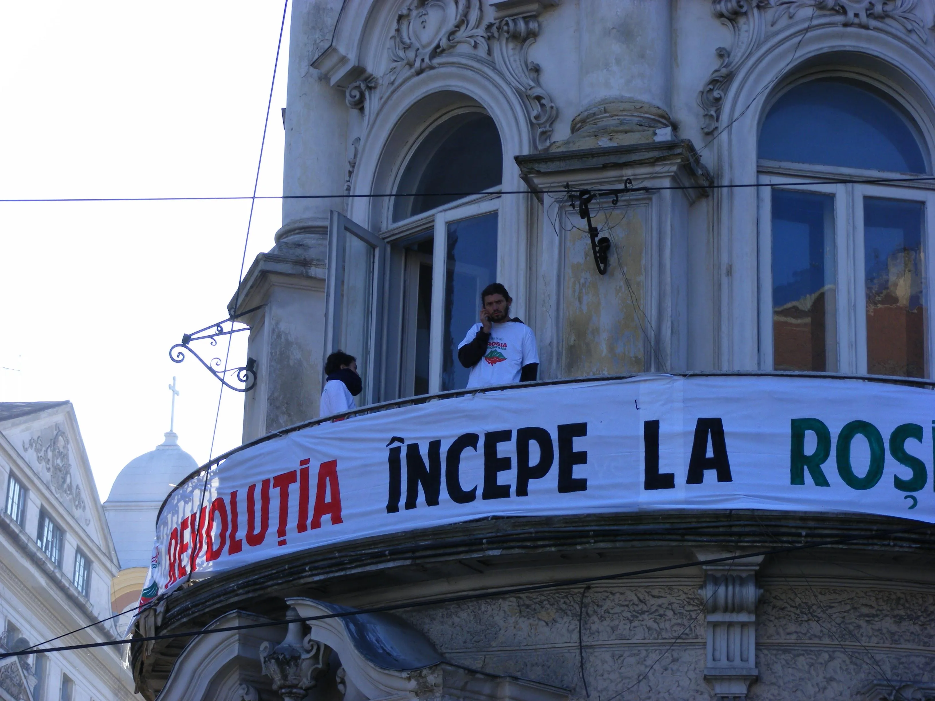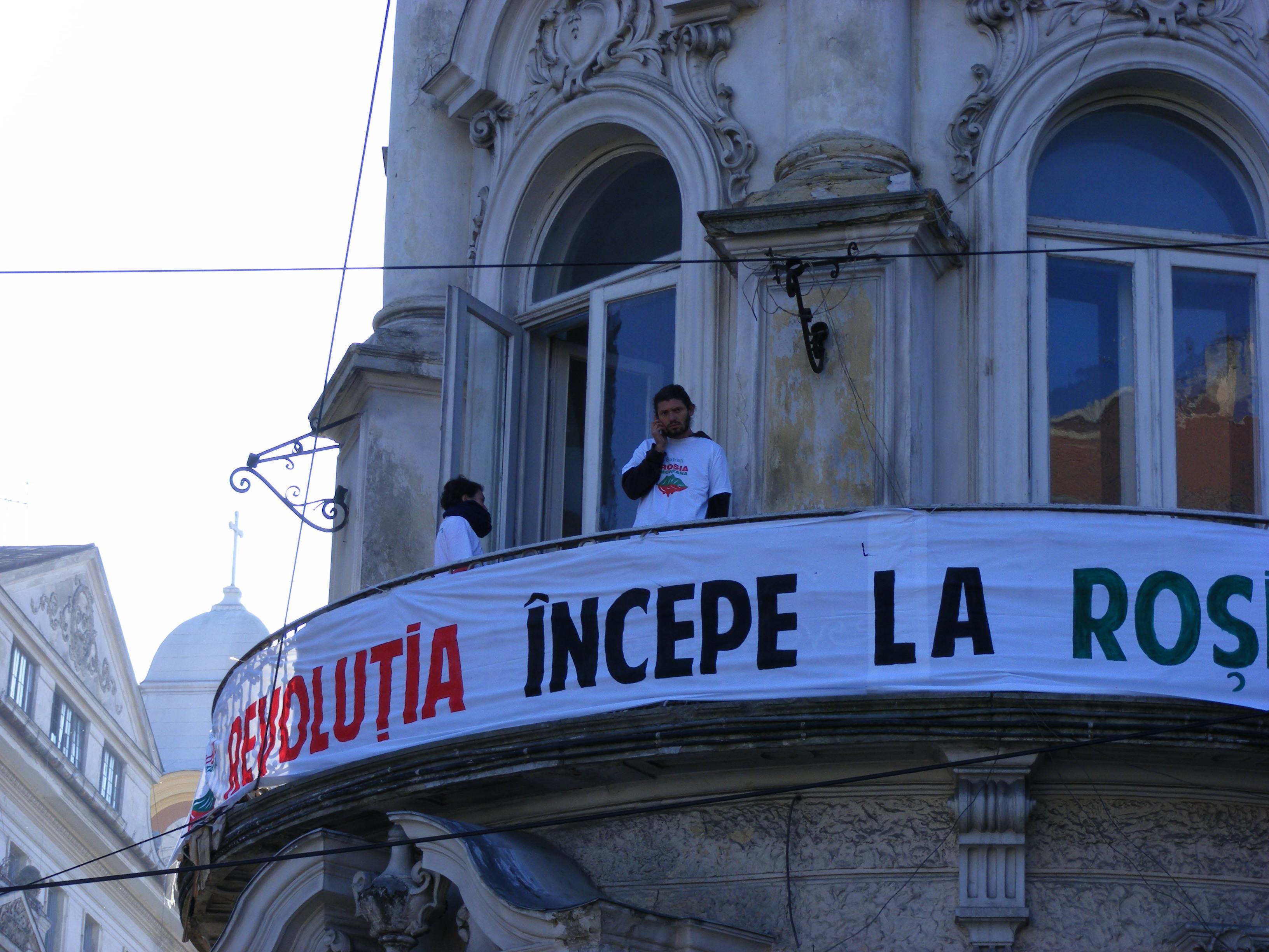 Simpatizantii miscarii nu au menifestat in niciun fel, dar au vrut sa "sarbatoreasca" victoria din prima parte a zilei, cand sase ecologisti au reusit sa se baricadeze in cladire si sa isi exprime dezacordul fata de proiestul initiat de compania Rosia Montana Gold Corporation (RMGC). Vezi AICI imagini din timpul protestului.
