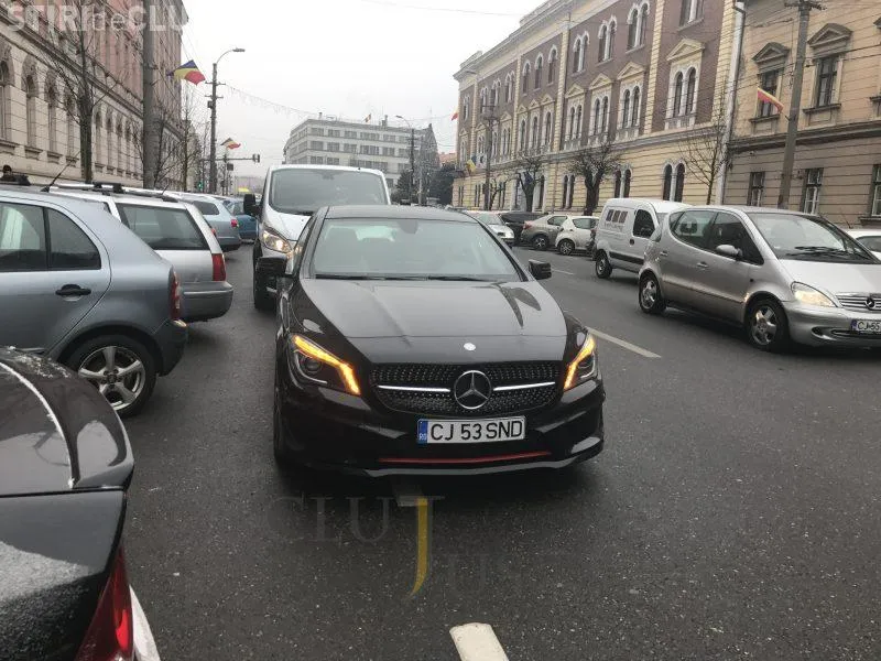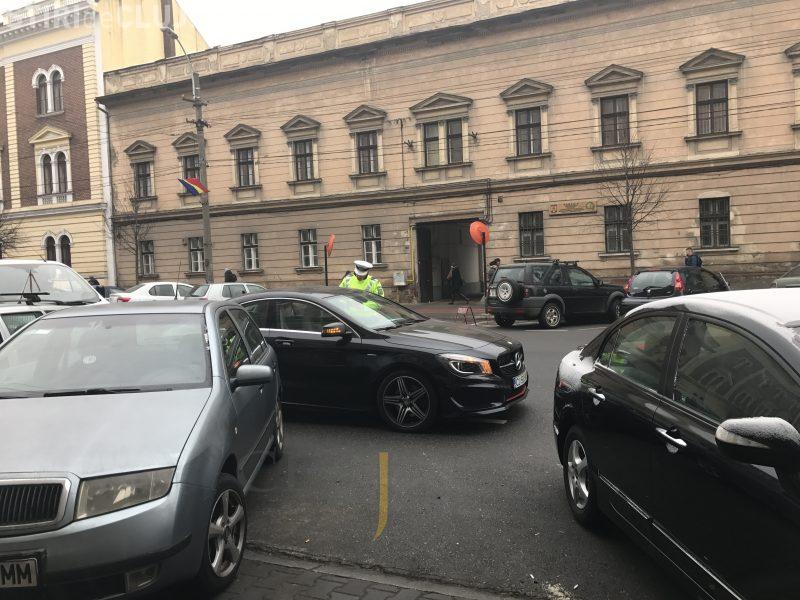 O tânără aflată într-un Mercedes negru a blocat, miercuri dimineața, o bandă de circulație în fața Tribunalului Cluj, pe strada Dorobanților. Când a venit polițistul să o amendeze l-a amenințat că dă un telefon.