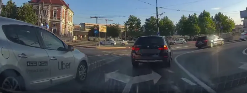 Camera de bord a șoferului a filmat momentul în care o mașină inscripționată cu semnele Uber încearcă să îi taie calea. Acesta nu s-a lăsat mai prejos de tupeul mașinii de ridesharing și și-a continuat drumul.
