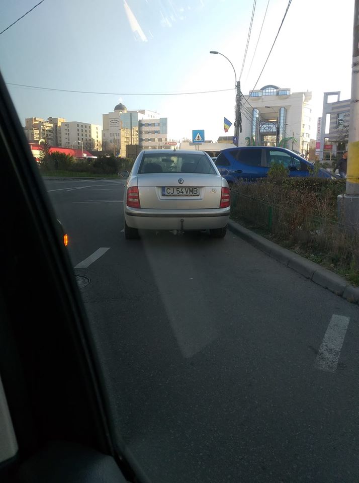 Imaginea este ireală, dar cât se poate de adevărată. Șoferul s-a chinuit să pună mașina la bordură, dar tot este un pericol pentru circulație.