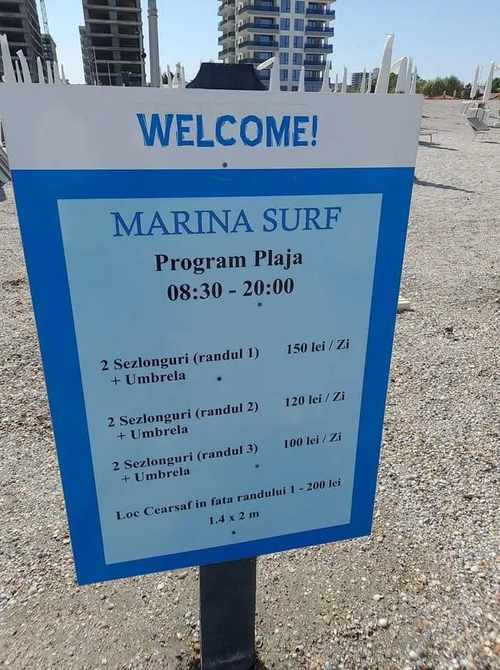 Turiștii care ajuns la Marina Surf au de achitat 200 de locul loc pe cearceaf, dacă vor să stea în fața rândului 1 de șezlonguri. Cei care administrează plaja, domeniul public închiriat de la stat, au si specificat cât poate ocupa cearceaful: 1,4 metri pe 2 metri lungime.