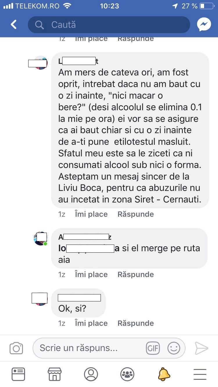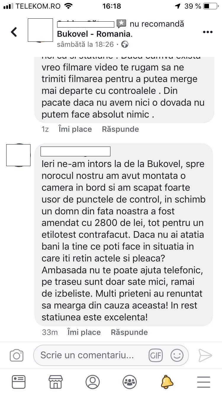 Am plecat la ski in 02.01.2019 spre Bukovel, am ajuns cu bine, insa la intoarcere eu si prietenul meu, sambata 05.01.2019 in jurul orelor 11:00-12:00, am fost opriti la primul punct de control dupa Bukovel inspre vama Sighet cu Romania. Acolo ne-au cerut actele, le-am dat si apoi soferul a fost dus inauntru, o casuta mica, acolo erau vreo 4 insi in uniforme, i-au pus fiola pentru a verifica daca a consumat alcool. I-a iesit ca a consumat alcool, desi nu era adevarat, soferul s-a speriat, le-a zis ca nu avea cum sa iasa rezultatul asta pentru ca el consumase o bere, cu o seara inainte, la cina. Atat le-a trebuit sa auda, ca au început sa zica ca 48h nu trebuia sa bea nici o picatura si a urmat circul. Au spus ca amenda va fi de 22000 uha, ca e toleranta 0 la alcool si chiar si platita amenda ii vor retine actele 3 ani, daca vrea sa plece linistit i-a cerut 700 euro. Asa ca soferul a revenit dupa portofel, a dat 500 euro si 1000 de lei sa ii dea actele sa ajungem in tara. Eu stand in masina, am observat cum opreau masini de RO, nu opreau nici o masina de Ucraina. Reveniti in tara, am aflat ca este o practica des intalnita, chiar dupa noi, duminica a platit un domn 2800 lei, conform relatarii unui turist. Ce se intampla cu turistii romani? Nu sunt doriti si sunt jefuiti? Va rog anuntati populatia despre aceste practici, se pare ca prin furt acesti oameni devin bogati. Noua ne-au luat toti banii, pur si simplu, nici bani pt combustibil nu ne-au lasat. Exact 50 lei i-au lasat in portofel, nu stiu cat inseamna in uha dar e extrem de putin”, ne-a relatat Sabina, martoră la acest incident.