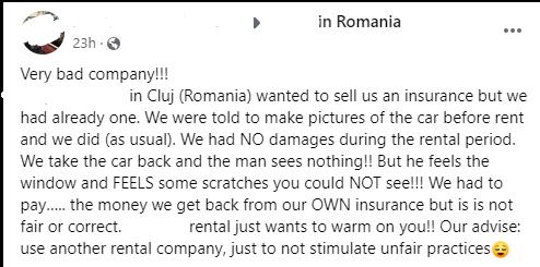 ,,(n.red O companie de închirieri auto) din Cluj (România) a vrut să ne vândă o asigurare dar aveam deja una. Ni s-a spus să facem poze cu mașina înainte de închiriere și am făcut-o (ca de obicei).
