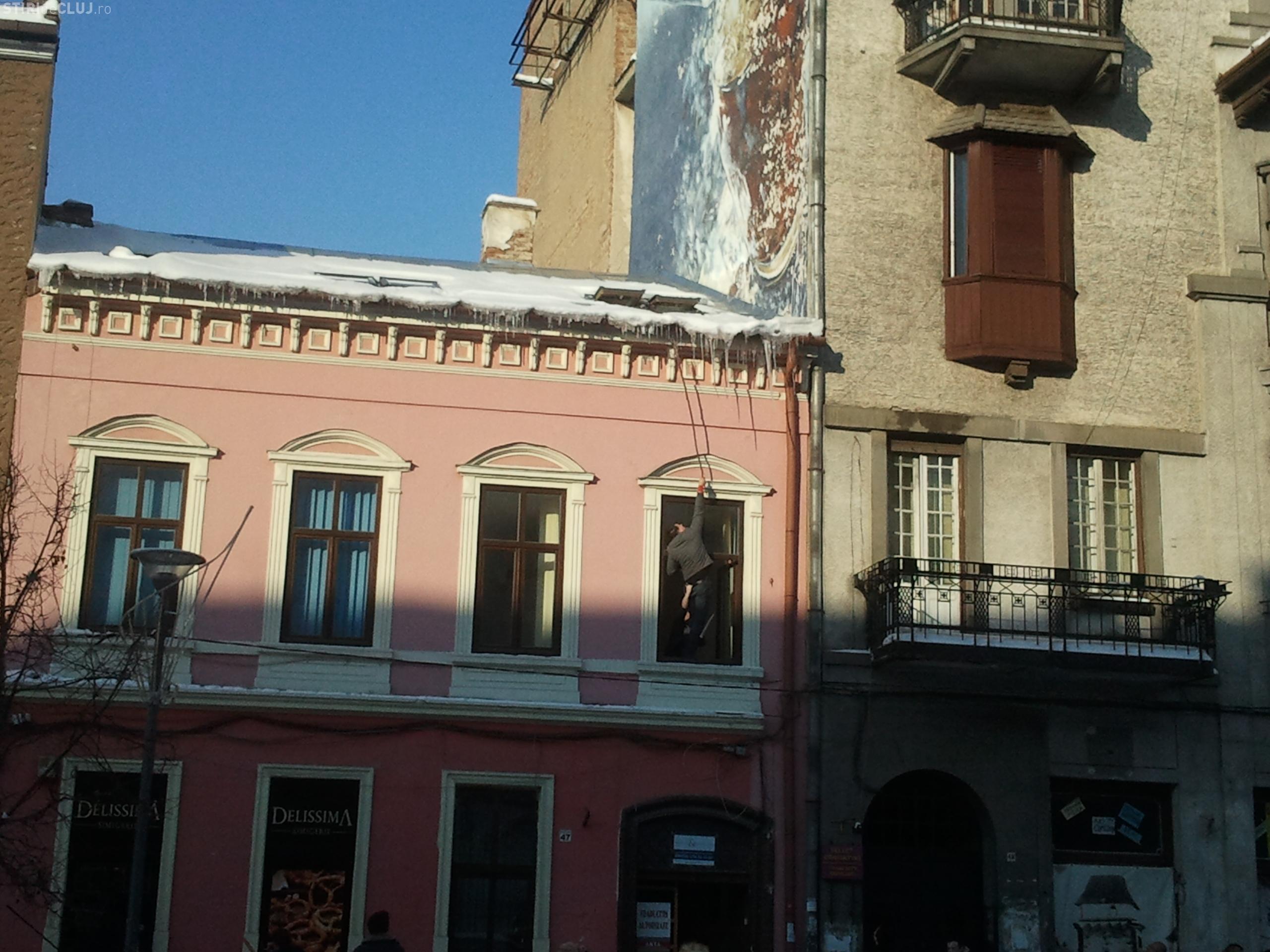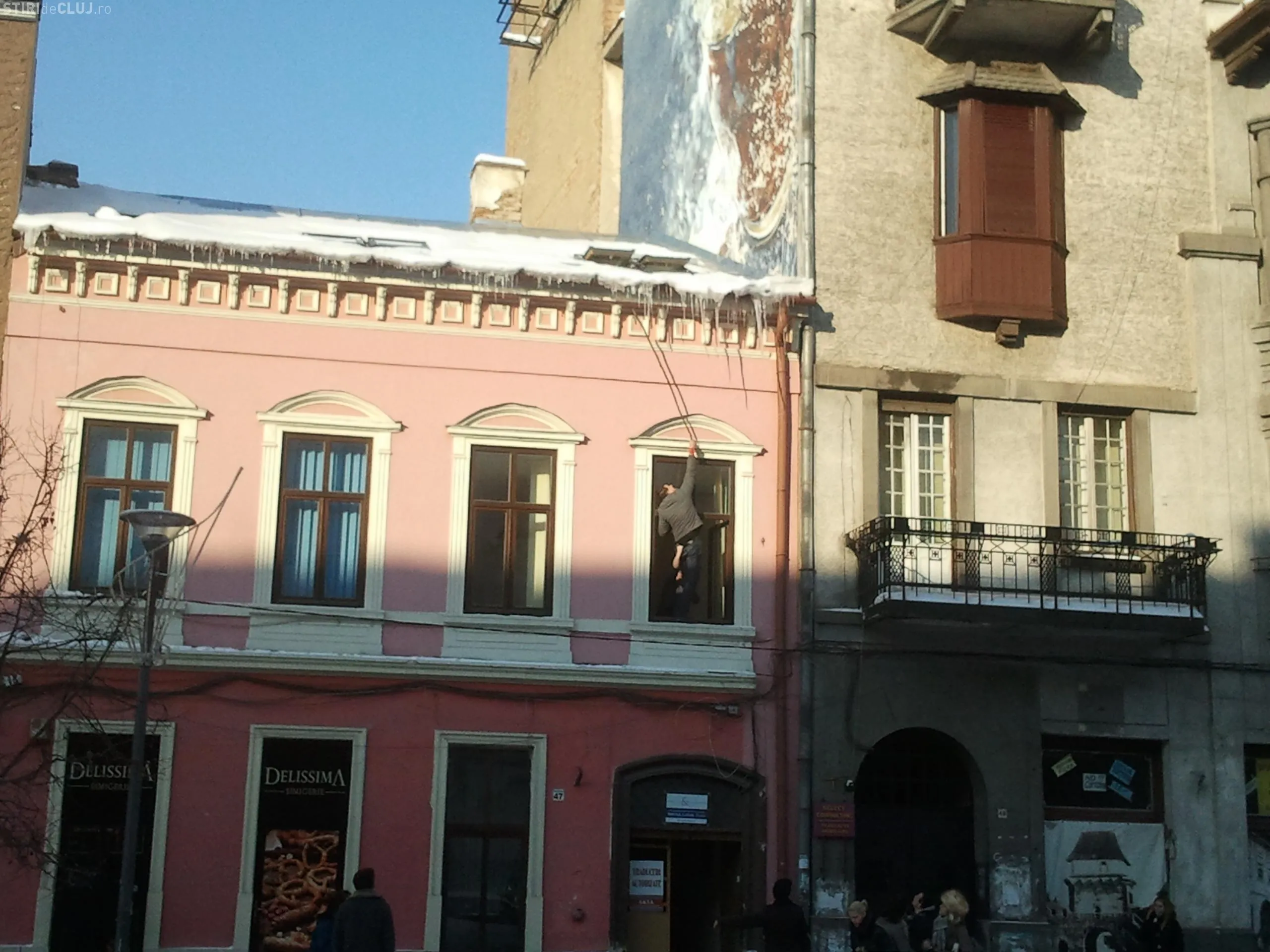 Un clujean a fost filmat în timp ce curăța țurțurii de la o clădire de pe Bulevardul Eroilor cu bâta, punându-și viața în pericol.