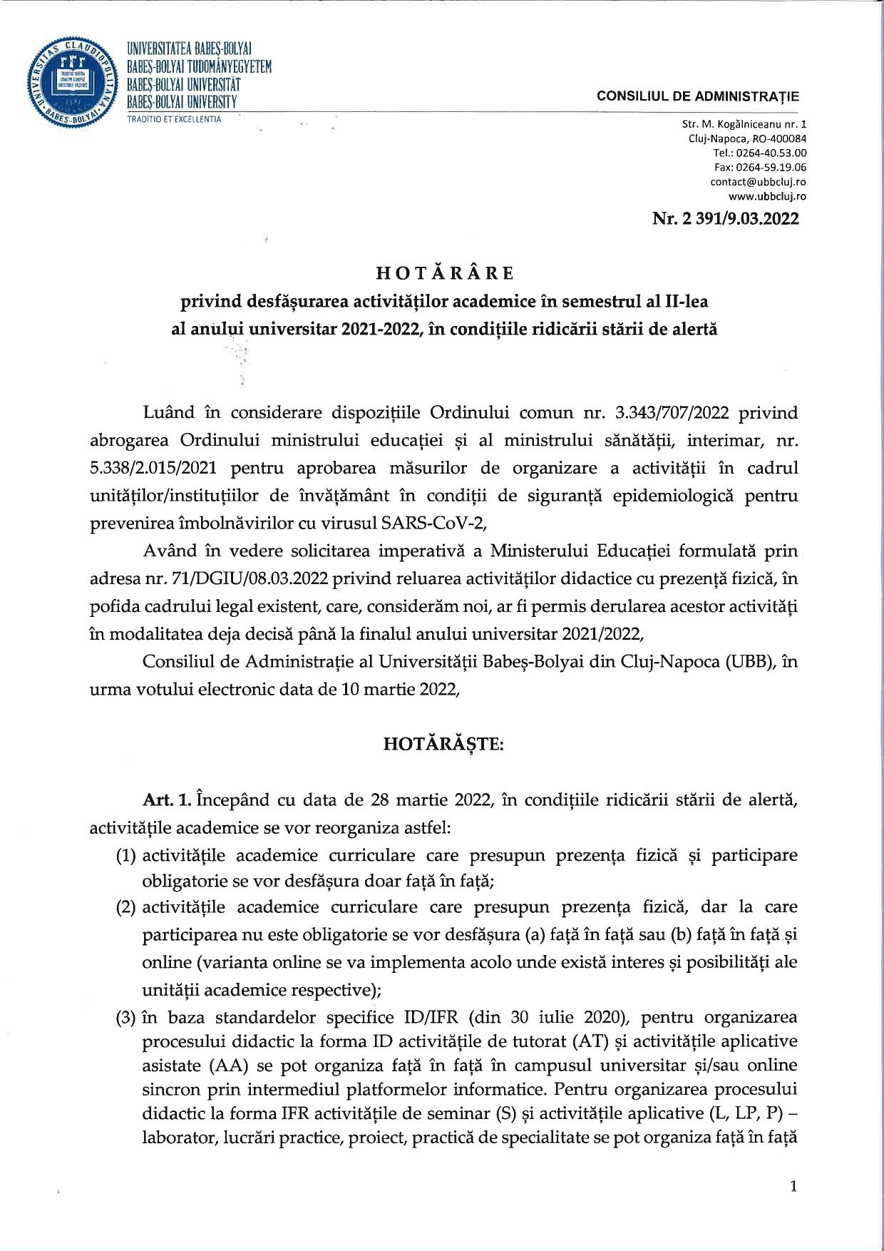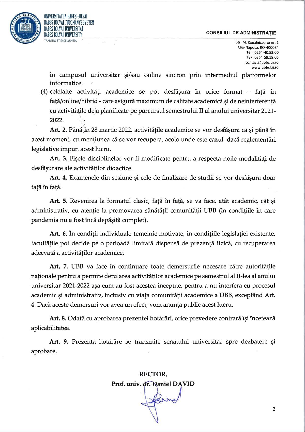 Prin propunerea făcută am încercat să îmbinăm cât mai bine toate aceste constrângeri, deși sinteza dintre teză și antiteză este dificilă în acest caz. Soluția Consiliului de Administrație al UBB va fi discutată luni (14 martie 2022) în cadrul ședinței Senatului UBB, unde, dincolo de discuția legată de aprobare, ținând cont și de prezența în număr mare a studenților, am solicitat să avem și o dezbatere mai generală pe principii, care poate ne ajută să facem împreună sinteze și mai bune”, se arată în comunicatul UBB.