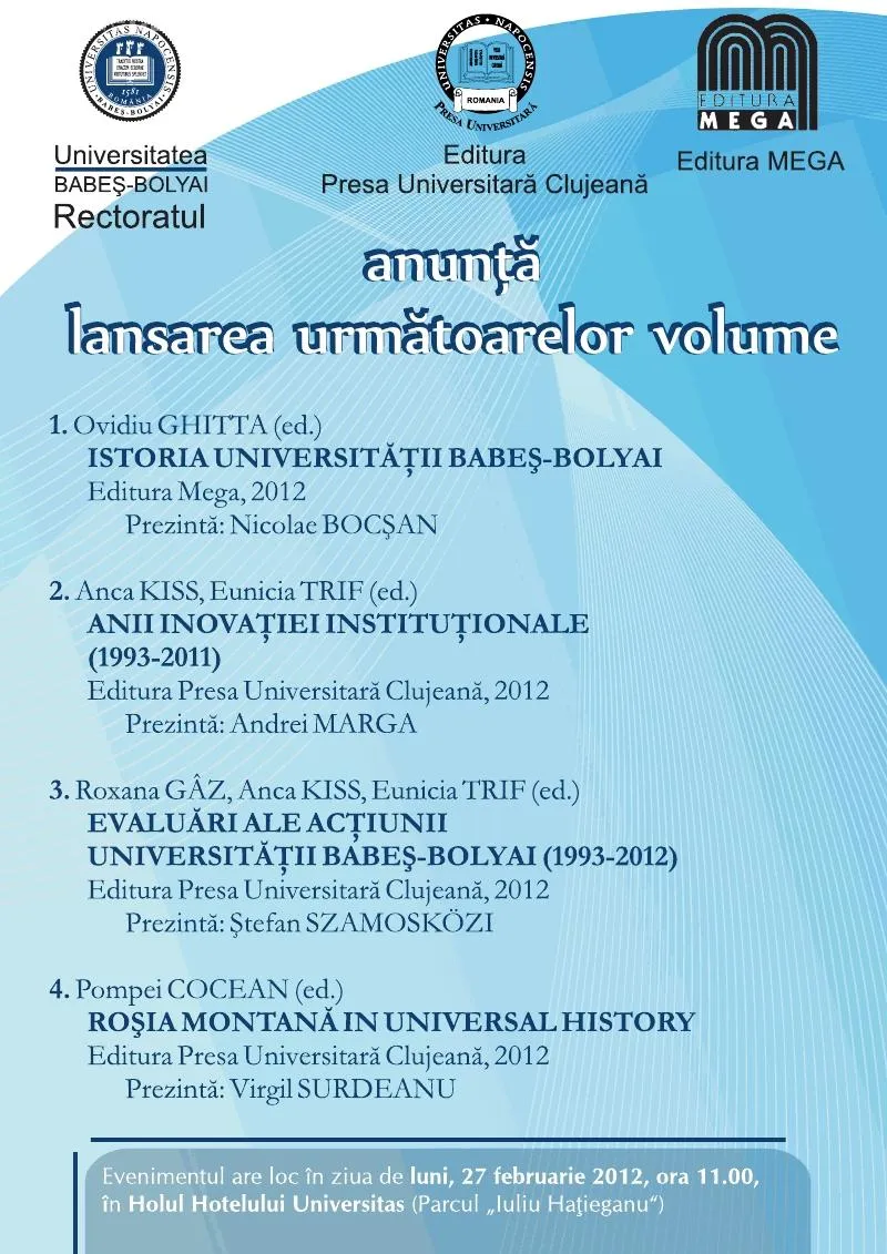 "Istoria Universitatii Babes-Bolyai", ce-l are ca editor pe Ovidiu Ghitta, "Anii inovatiei institutionale" (1993 – 2011), editori - Anca Kiss si Eugenia Trif, "Evaluari ale actiunii Universitatii Babes-Bolyai" (1993 – 2012), editori Roxana Gaz, Anca Kiss si Eunicia Trif si "Rosia Montana in universal history", editor Pompei Cocean.