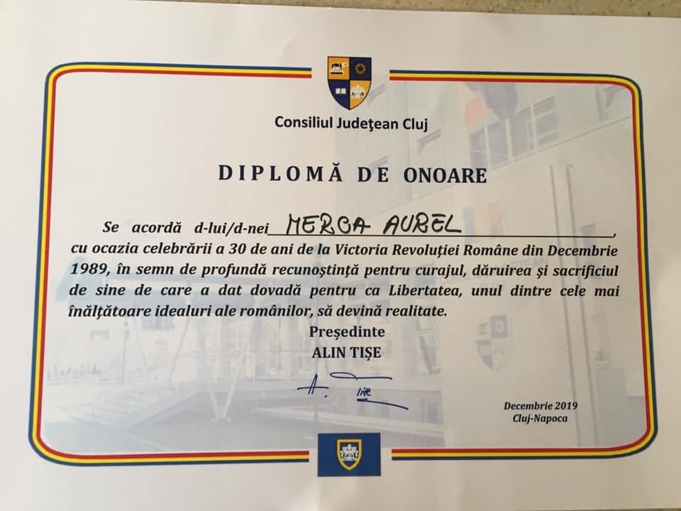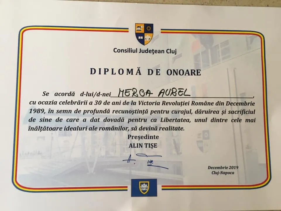 ”Au scrie pe Diploma de Onoare numele cu markerul pe moment, deoarece Consiliul Județean Cluj a uitat sa faca diplome și pentru Eroii Martiri ai Revoluției din ‘89!! Au primit doar răniții și luptătorii. Morții nu sunt importați, din păcate, ei nu s-au sacrificat !! Sa va fie rusine !!!”, a relatat Adriana Merca, fiica Eroului martir din Revoluție.