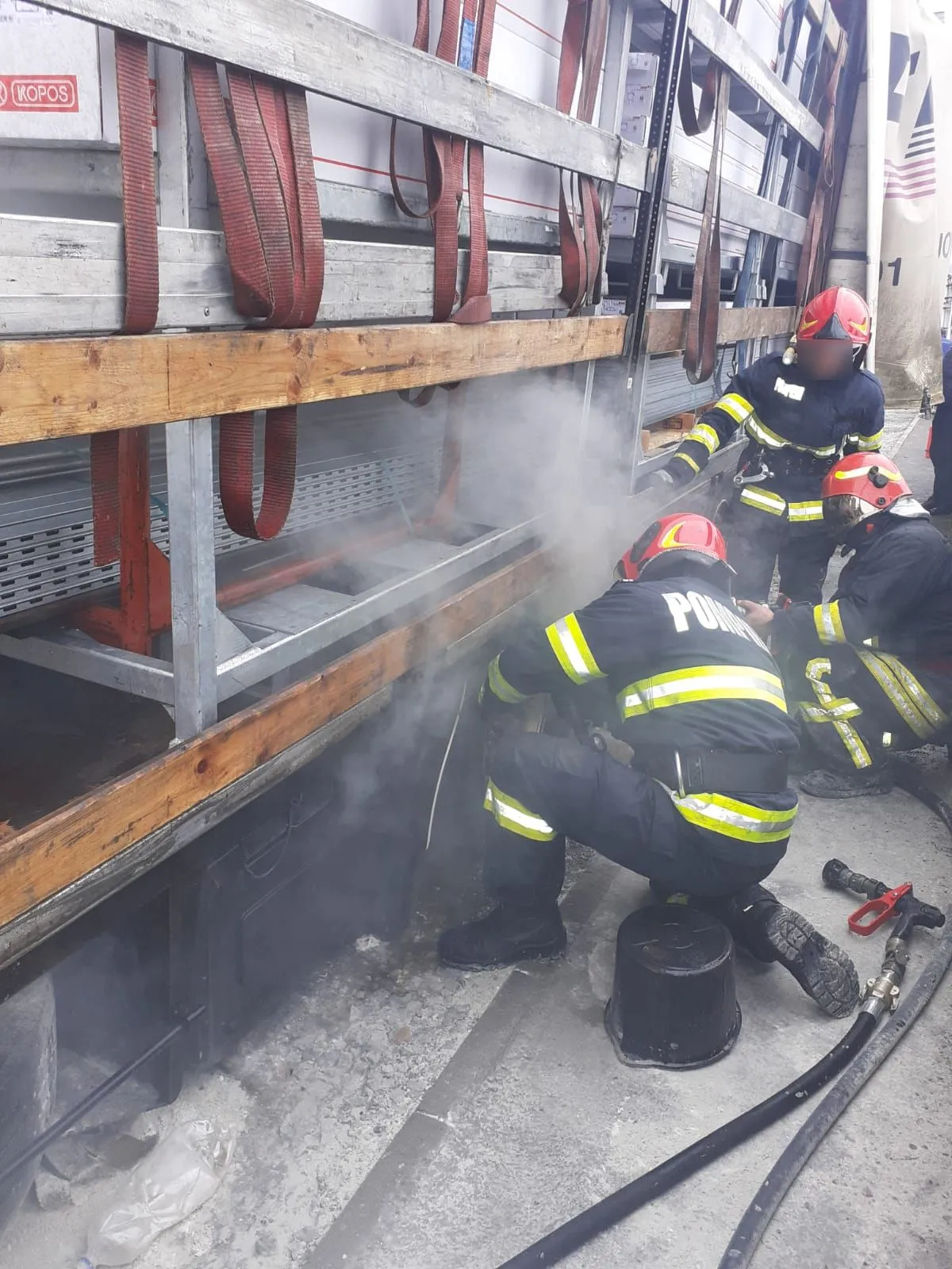 „În momentul sosirii autospecialelor la fața locului, focul se manifesta la unul dintre cauciucurile situate sub remorca autovehiculului, intervenția șoferului, ajutat de alți participanți la trafic cu stingătoarele din autovehicule, a limitat extinderea flăcărilor la încărcătura camionului. Focul a fost stins în scurt timp, iar în urma acestui eveniment nu au fost persoane rănite.