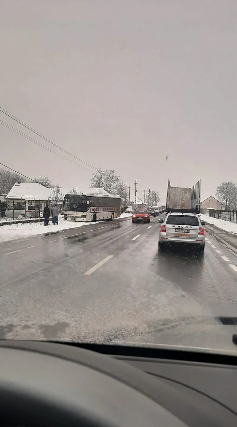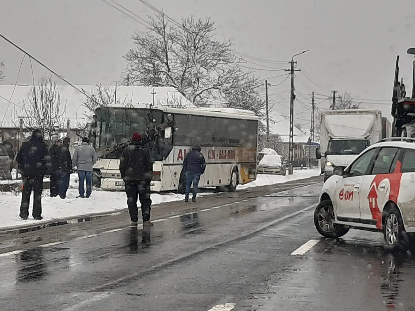 ”Un autocar a lovit un stalp de curent. Firele sunt peste sosea. Se circula, dar foarte greu”, spun martorii.